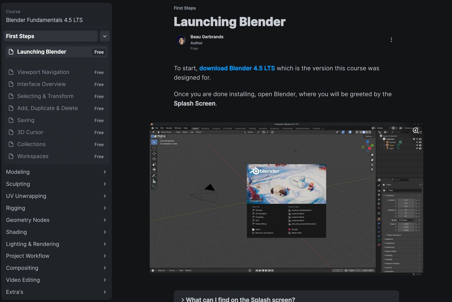 「Blender Fundamentals 4.5 LTS」は、安定して長く使えるBlender 4.5の長期サポート版(LTS、Long Term Support)を基準に制作されており、テキストと画像、動画を組み合わせた形式で、学習のしやすさと最新情報の反映しやすさに配慮された無料のオンラインコース。静止画をベースにした作品づくりの標準的な工程をひと通り学ぶことができる。