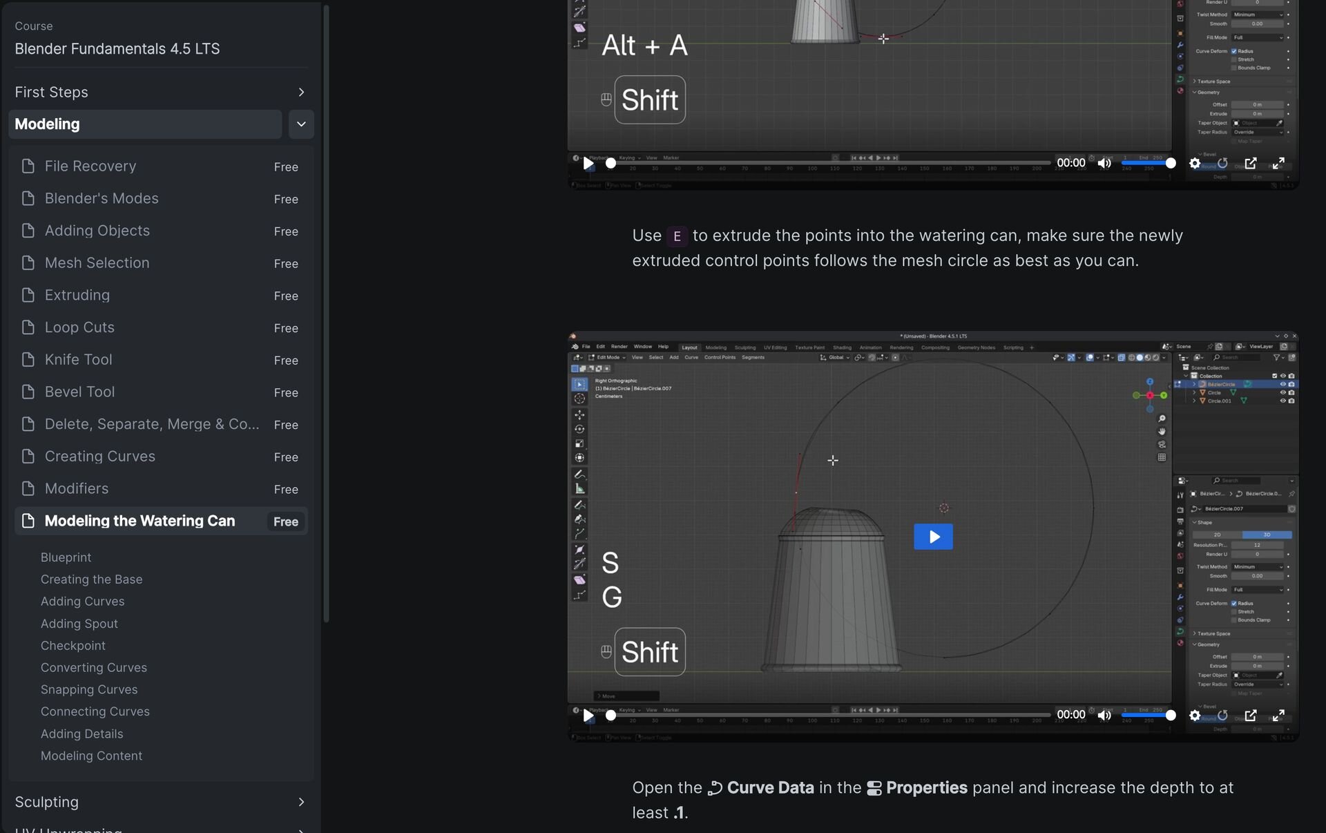 学習は、ファイルの復元やBlenderのモード、オブジェクトの追加、メッシュの選択といった、作業を始めるための基礎知識と操作からスタート。続いて、押し出し、ループカット、ナイフツール、ベベルツールといった主要な形状編集ツールの使い方や、要素の削除・分離・マージ・結合といった細かな編集方法について習得する。さらに、カーブの作成やモディファイアーの理解に進み、セクションの最後には総括的な実践としてWatering Can(じょうろ)を制作する。