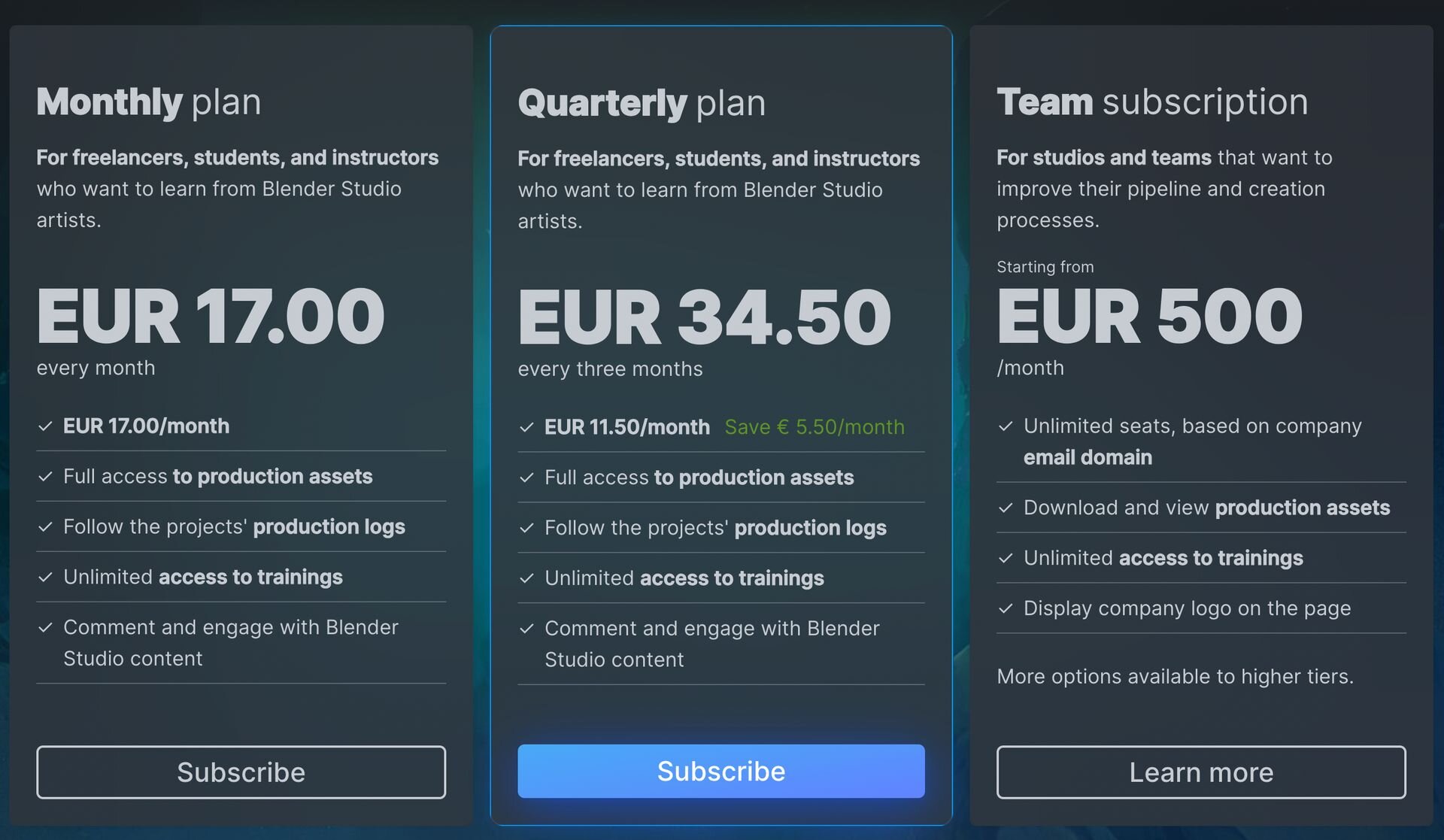 Blender Studioでは、実際の制作アセットへのアクセスや学習コンテンツが制限なしで利用可能になる有料のサブスクリプションプランを提供している。フリーランスのクリエイターや学生、指導者に向けたMonthly planは月額17.00ユーロ(約3,110円)、3ヶ月ごとの更新で割安となるQuarterly planは34.50ユーロ(約6,310円)で提供されている。また、制作会社やチームによるパイプライン改善などを想定したTeam subscriptionは、企業のメールドメインに紐づいて人数無制限で利用でき、月額500ユーロ(約91,390円)からとなっている。