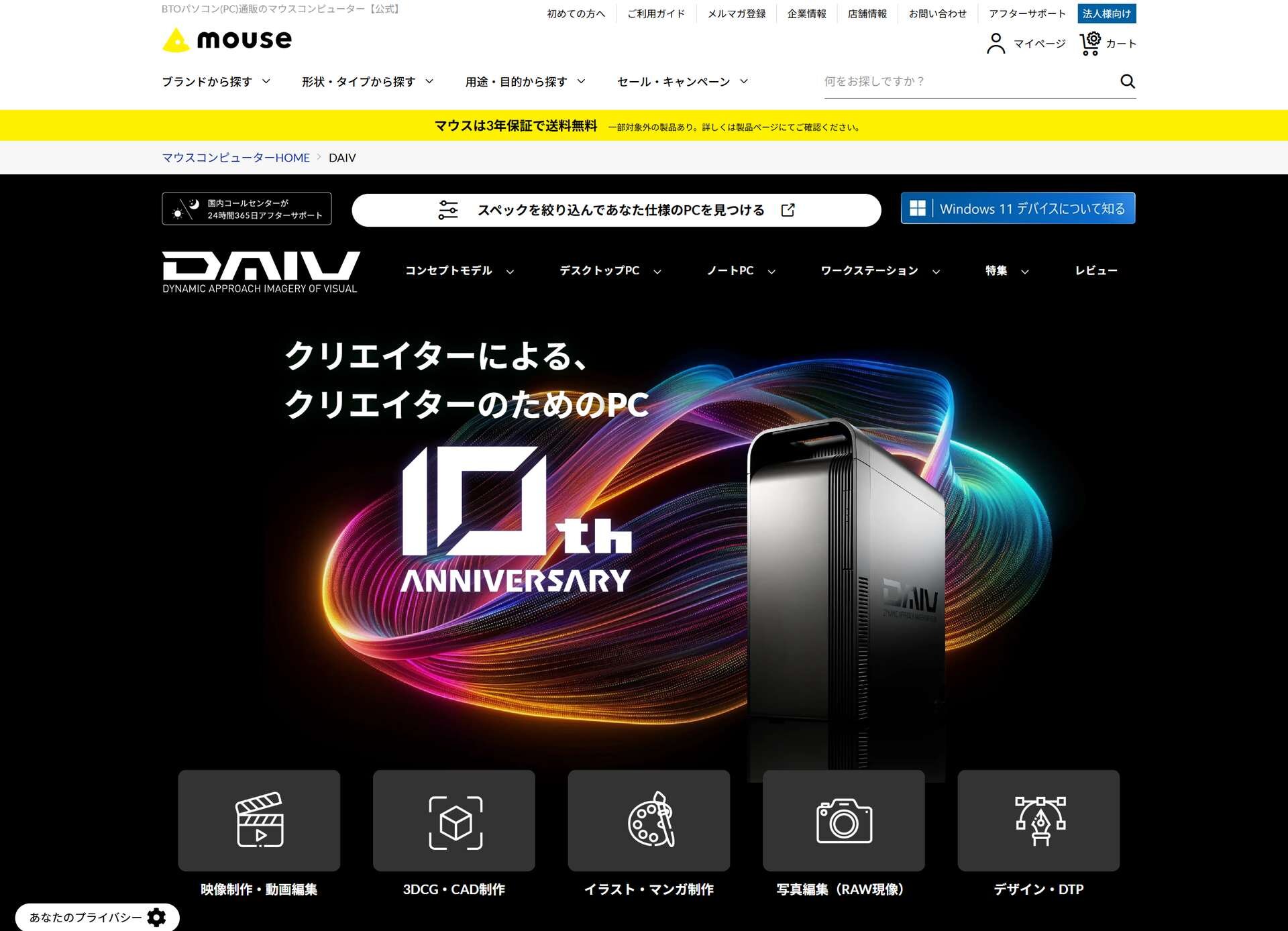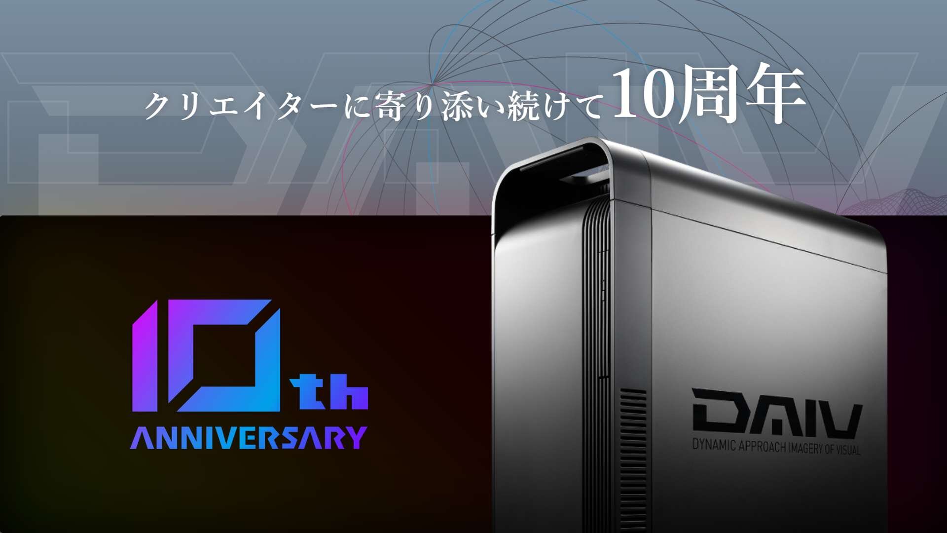 株式会社マウスコンピューターが展開するクリエイター向けPCブランド「DAIV」は2月24日(火)、創立10周年を迎えた。これを記念し、同社は10周年特設ページを公開するとともに、クリエイティブソフトが付属する「DAIV 10周年 限定セットモデル」の販売や記念クーポンの配布、OSの無償アップグレードキャンペーンなどの各種施策を発表した。あわせて、ブランドのトップページをリニューアルし、10周年に合わせた記念ロゴを公開している。