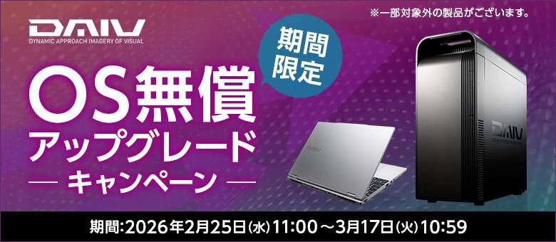 また、3月17日までの期間限定で、対象製品をディスカウントできる「10周年記念クーポン」の配布と、DAIV全モデルを対象としたWindows 11 HomeからProへの無償アップグレードキャンペーンも開始されている。