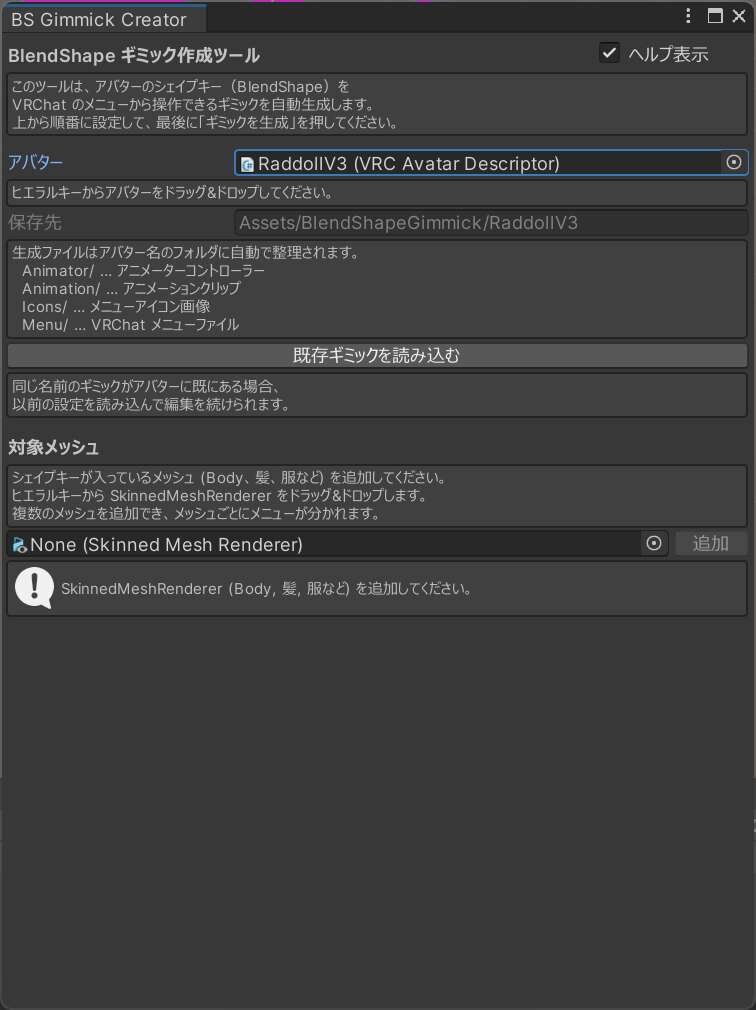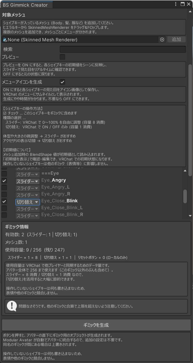 「BlendShape Gimmick Creator」は、対象となるアバターのSkinnedMeshRendererデータと、変形用のデータであるシェイプキーを選択してボタンを押すだけで、アニメーターやアニメーション、メニューなど必要なファイルを自動で作成する。各シェイプキーに対して、無段階で調整可能なスライダーかオンオフ切り替えを選択でき、体型の微細な調整から衣装パーツの着脱まで幅広く対応する。