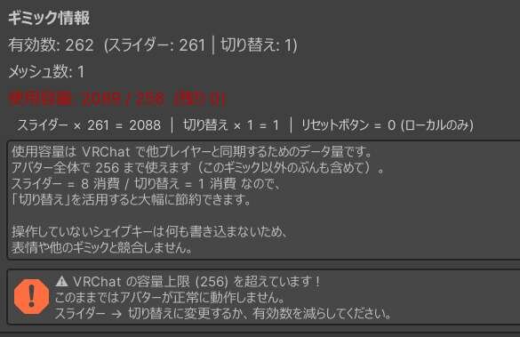 その他、シーンビュー上でのリアルタイムプレビュー機能や、VRChat内で通信に使用される同期容量(Synced Bits)を可視化する機能も搭載。上限超過時に警告が表示されるため、アップロード前に容量オーバーによる不具合を未然に防ぐことができる。