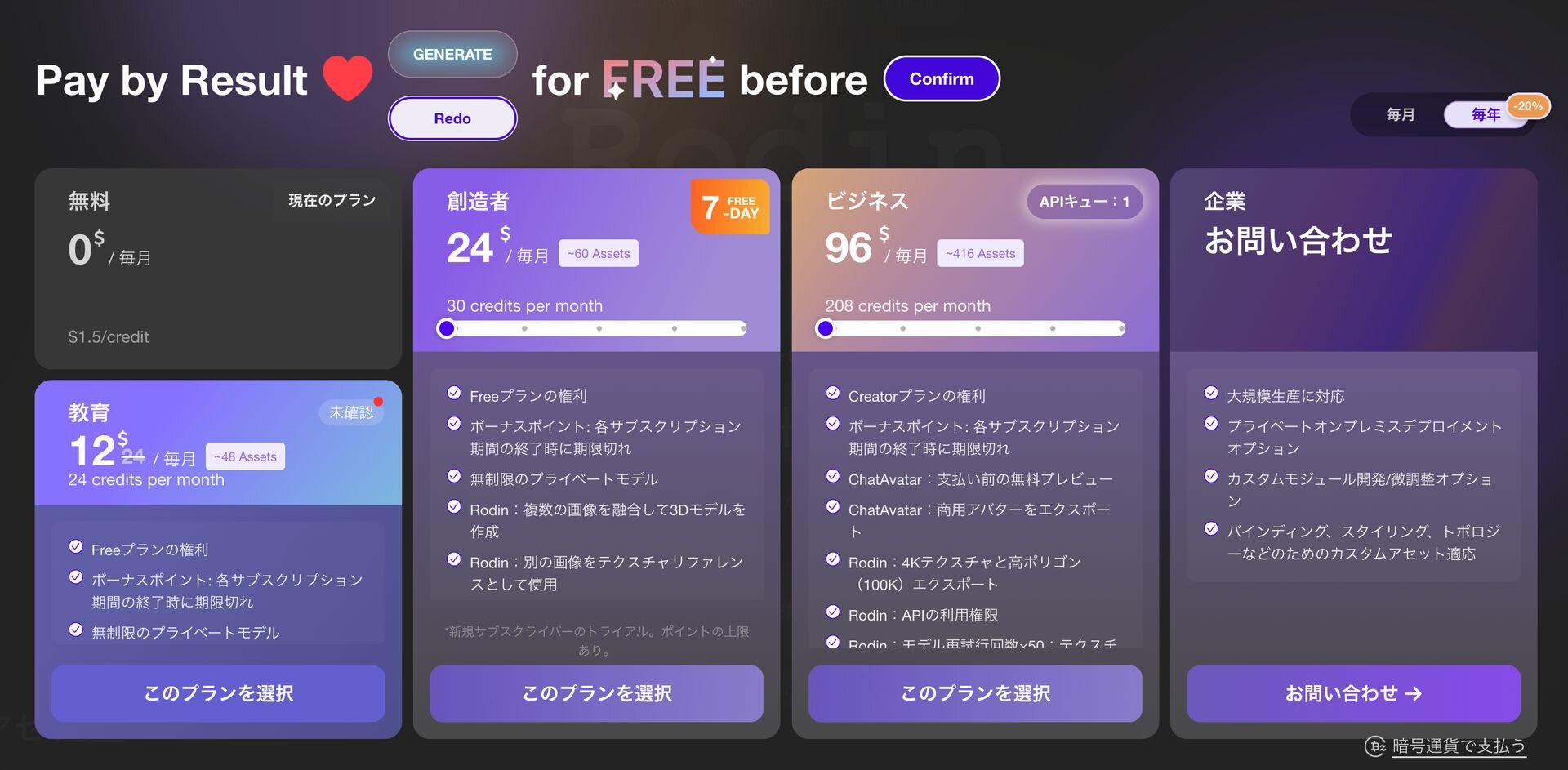 Rodinは無料プランでの試用に加え、4種類の有料サブスクリプションを利用できる。個人向けの創造者(Creator)プランは、年払いで月額24ドル(約3,660円)。月間30クレジットが含まれ、約60個のアセット生成が可能。無制限のプライベートモデル作成や、複数の画像から3Dモデルを生成する機能、画像をテクスチャのリファレンスとして使用する機能が提供される。