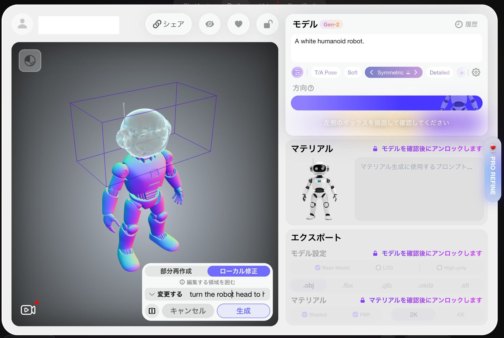 ▲バウンディングボックスを操作し、修正する箇所を頭部に設定した様子。プロンプトボックスには「turn the robot head to human boy’s」と入力