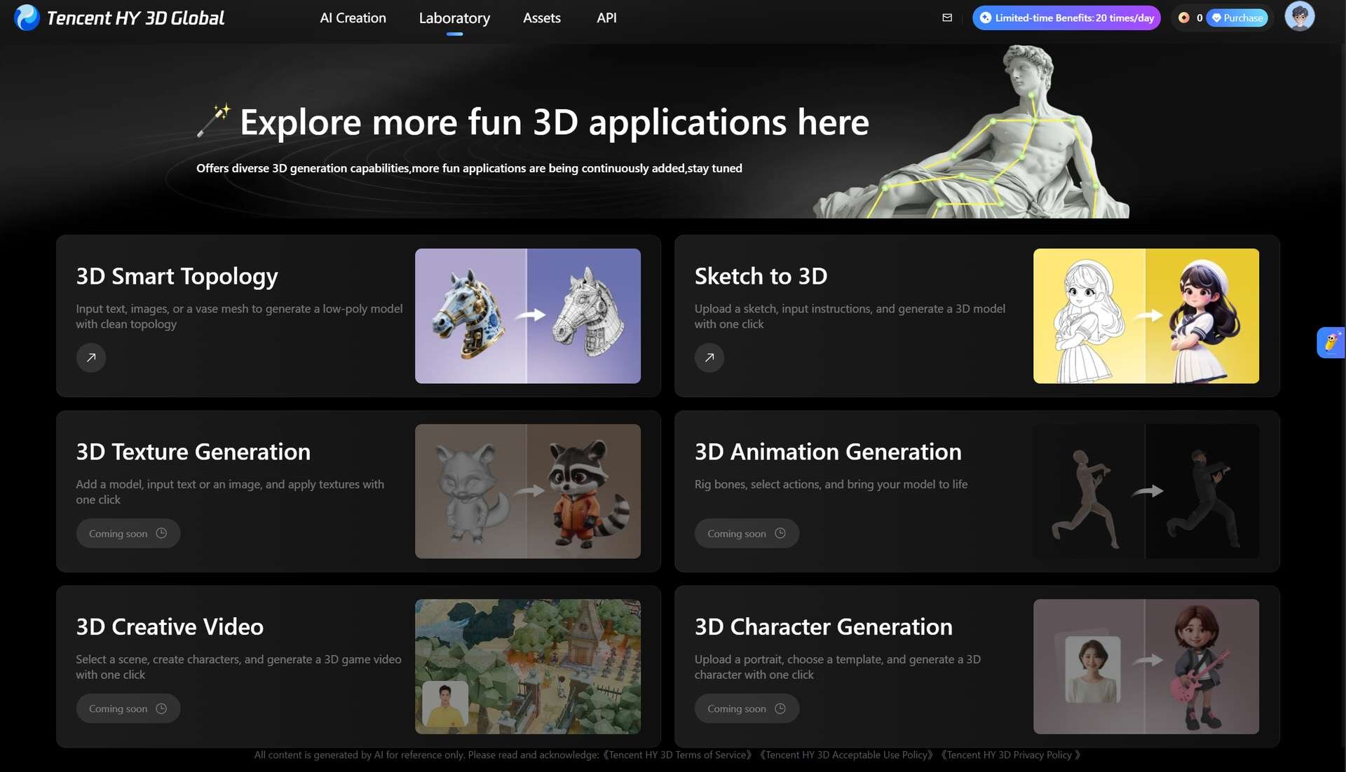 Tencent HY 3D Globalのワークスペースページ末尾には「All content is generated by AI for reference only.」と記載があり、生成したコンテンツはリファレンスとしての利用のみが認められている。