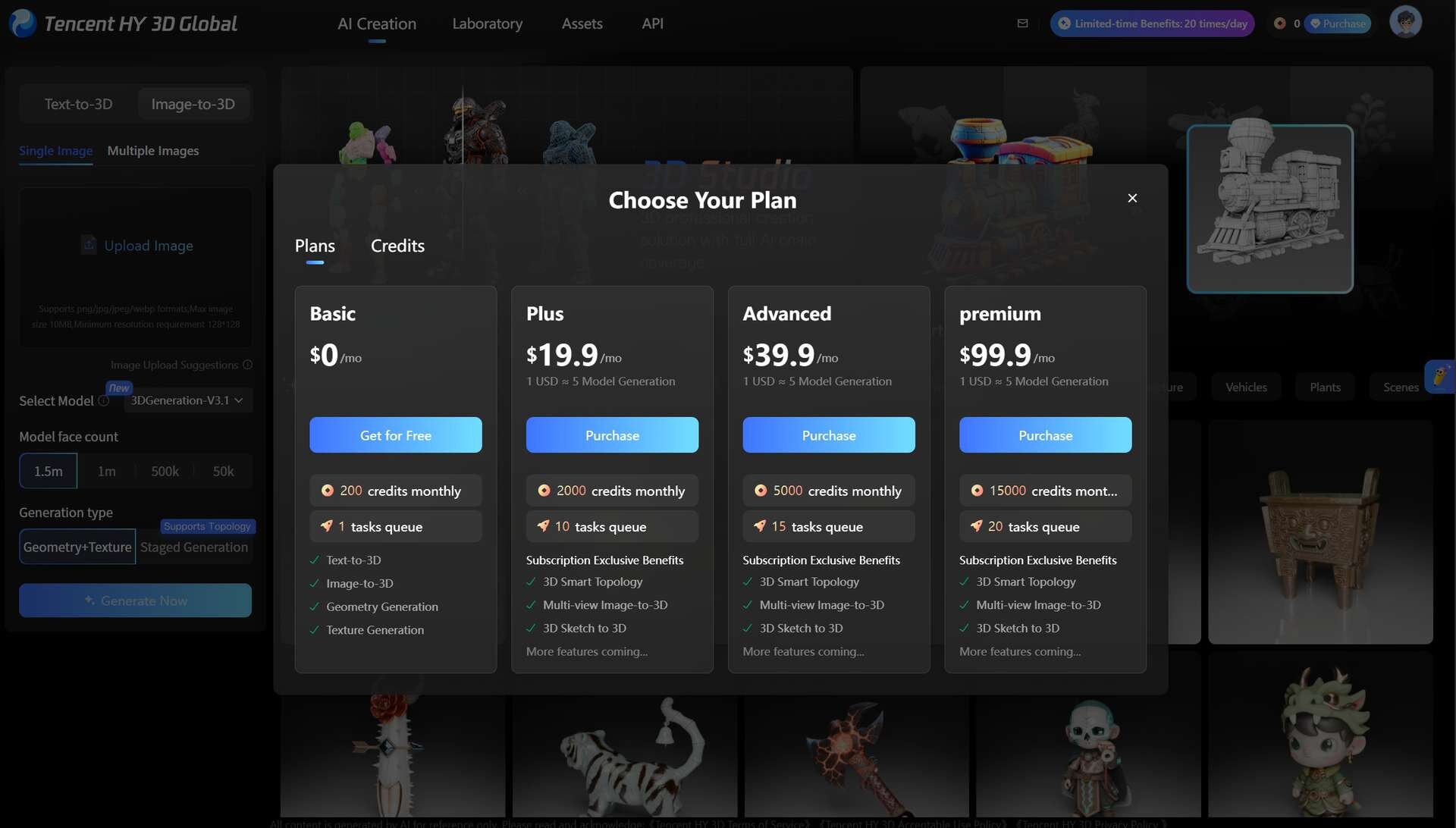 Tencent HY 3D Globalの公式ワークスペースには無料のBasicプランと有料のサブスクリプションプラン3種が用意されている。Basicプランは月間200クレジットが付与され、1件のタスクをキューに登録できる。有料のPlusプランは月額19.9ドル(約3,079円)で、月間2,000クレジットの付与に加え、最大10件の同時タスク処理が可能となる。このプランからは、AIによる最適なトポロジー構造の構築(3D Smart Topology)や、複数枚の画像からの生成、スケッチからの3D化といった機能が開放される。