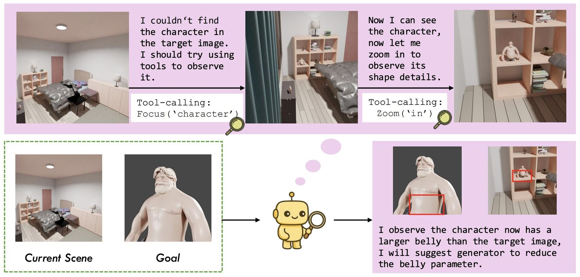 VIGAはコードを記述し、その結果生成されたシーンをレンダリングして入力画像と比較することでチェックを行います。カメラを移動させてシーンをより詳細に分析して差異を見つけ、プログラムを何度も改善するためのフィードバックを生成します。つまり、BlenderがVIGAにとっての「推論の媒体」となるのです。