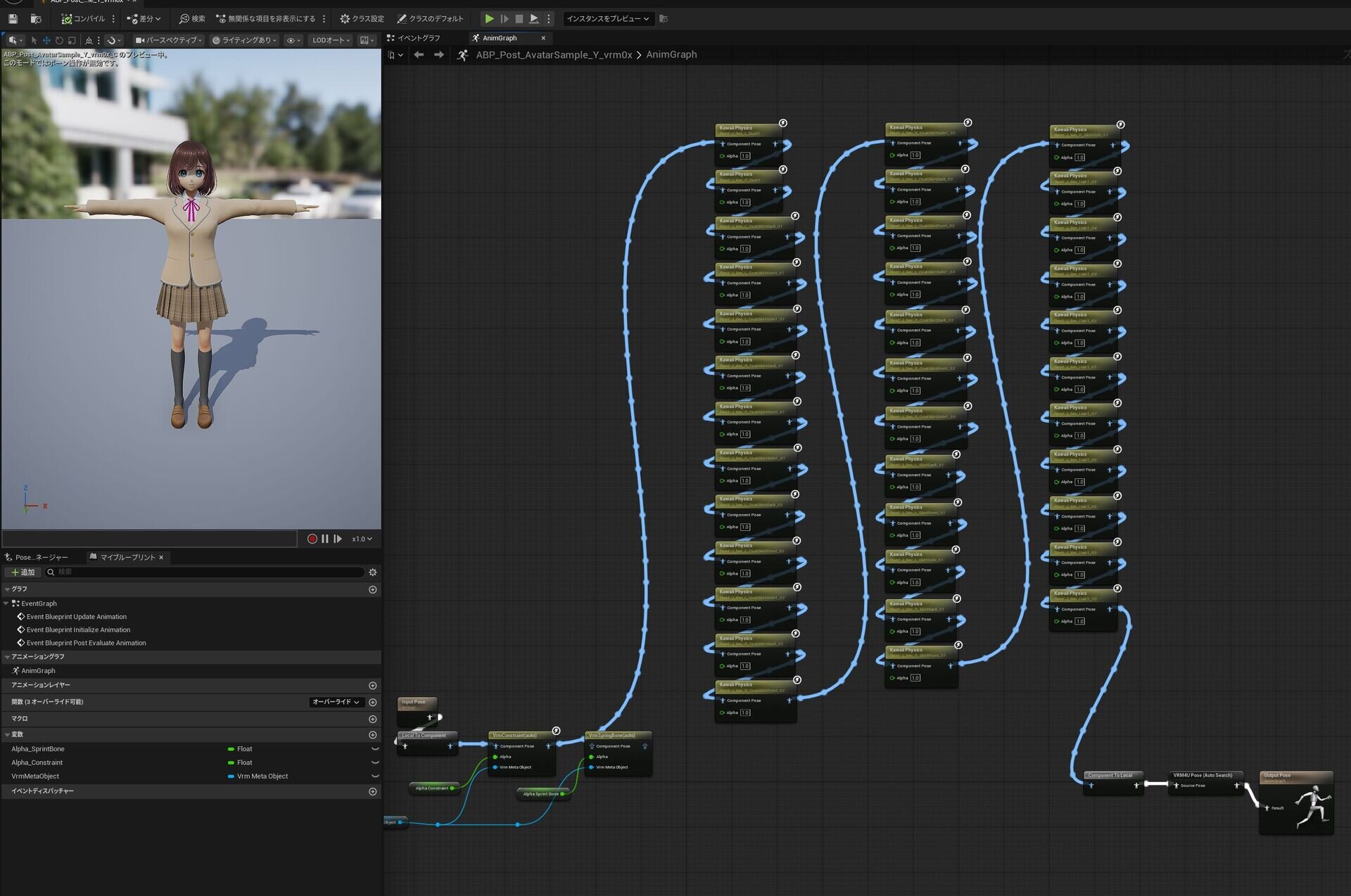 「VRM SpringBoneをKawaiiPhysicsに変換するツール」は、3Dアバターの標準規格「VRM」フォーマットにおいて、髪の毛や衣服などの揺れを表現するVRMSpringBoneの設定値を、UE用の軽量な揺れものプラグインKawaiiPhysicsの仕様に変換する。本ツールを実行してVRMSpringBoneから揺れものとコライダ情報をクリップボードにコピーし、そのデータをUE5のブループリント上でペーストすることで、KawaiiPhysics用に変換されたノードが配置される。