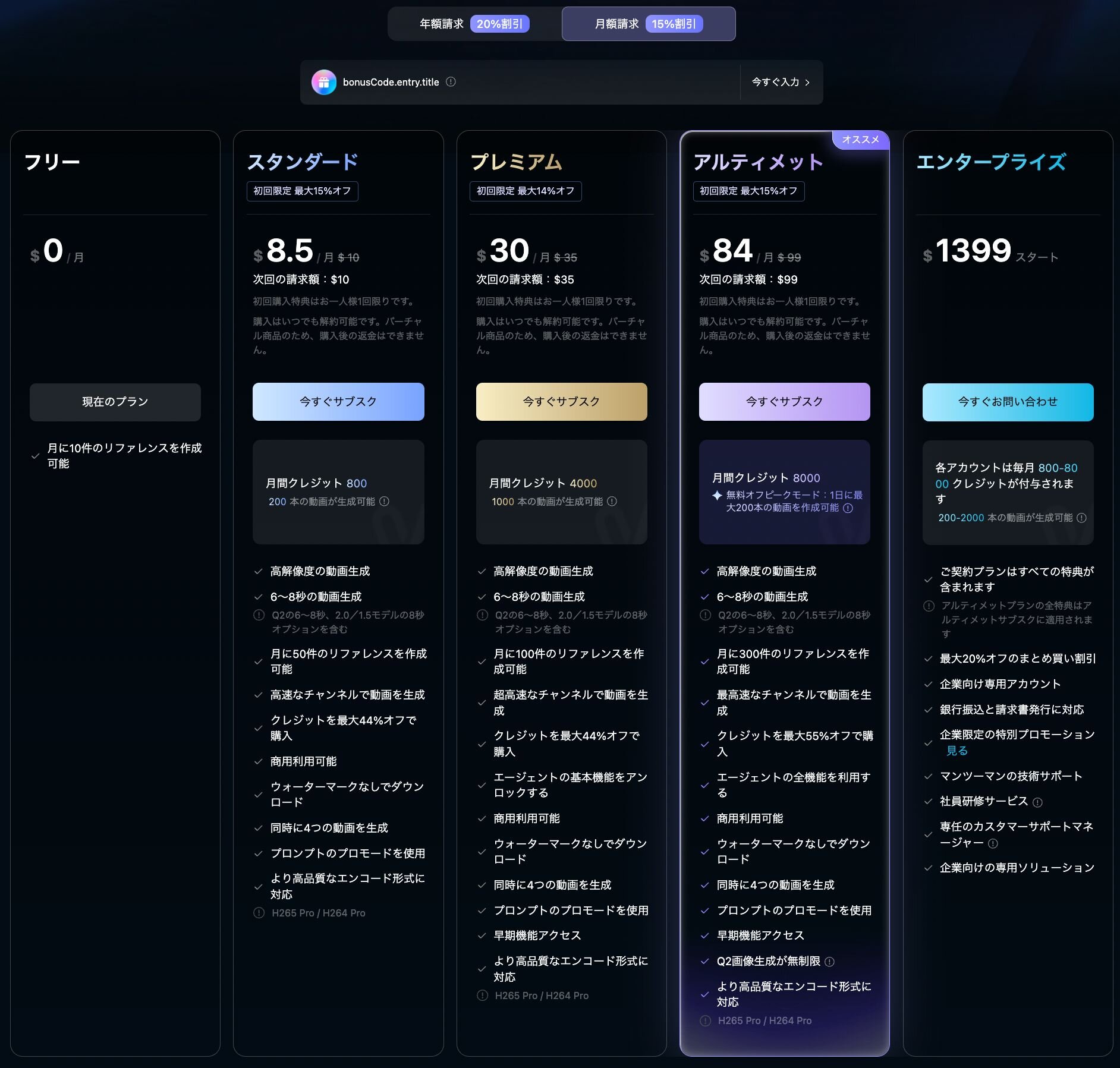 Viduの公式ワークスペースの利用には、無料プランと3つの有料サブスクリプションプランが用意されている。フリープランでは、月間80クレジットが付与され、約4秒の動画生成が可能だが、生成された動画には透かしが入り、商用利用は不可。生成速度は標準的なキュー配置となる。有料のスタンダードプランは月払いで月10ドル(約1,530円)。毎月300クレジットが付与され、透かしなし、一般商用利用に対応。生成の優先順位も高くなる。
