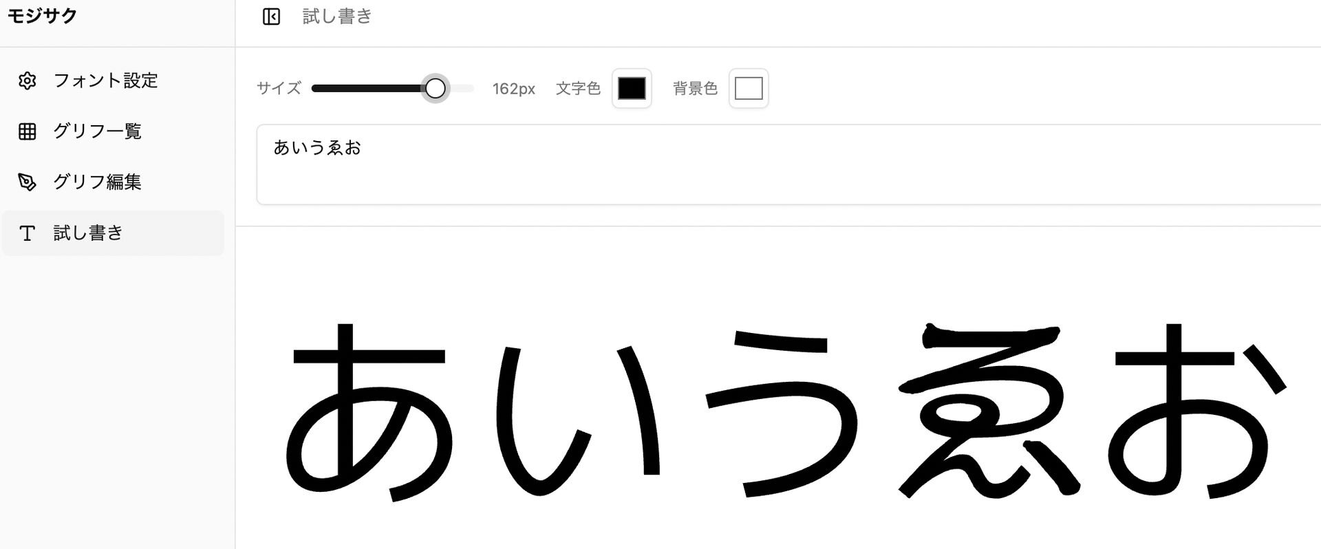 手書き感覚で文字を作成できるビットマップ編集モードでは、ブラシツールで直感的に描いた線画が自動的に滑らかなベクターパスへ変換される。グリフは制作中に試し書き画面に切り替えてプレビューでき、実際の文章の中での見え方やバランスを確認しながら調整できる。