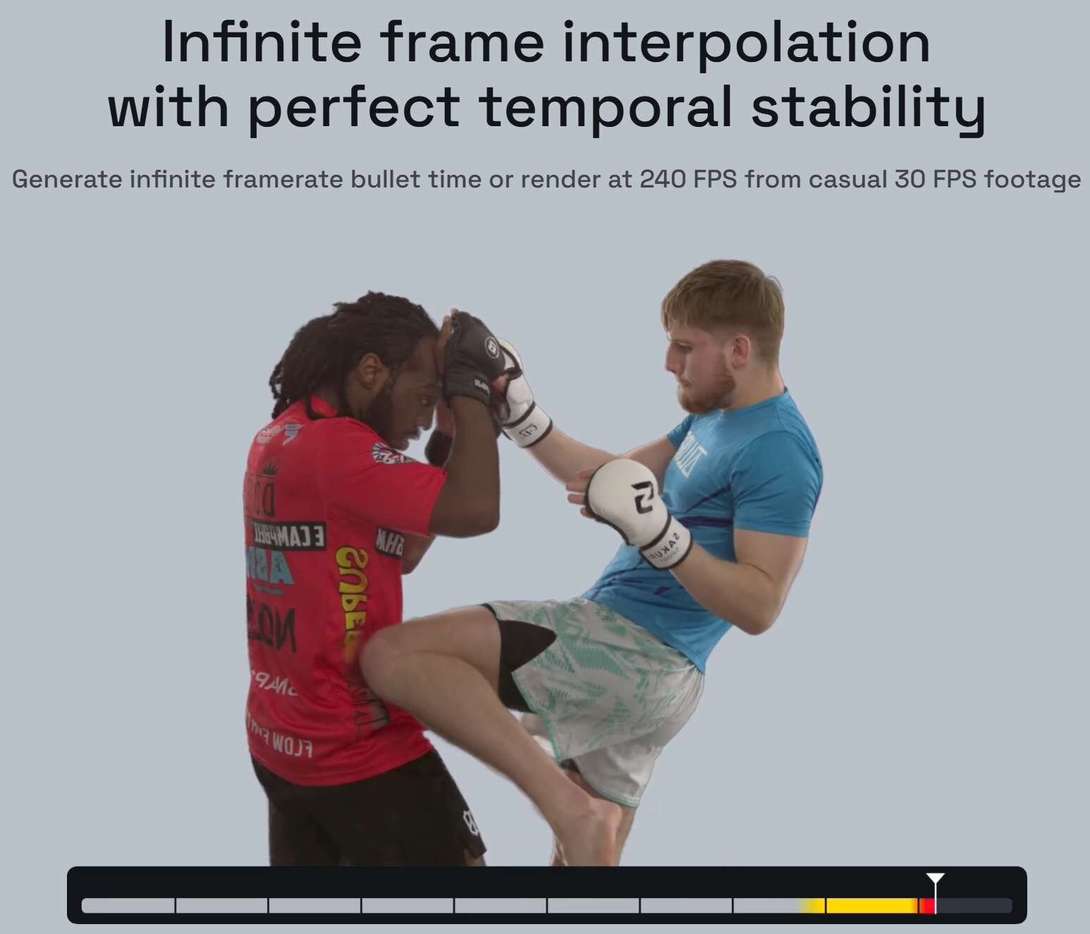 また、完全な時間的安定性を伴う無限のフレーム補間(Infinite frame interpolation)技術も導入。これは、一般的な30 fpsの映像から、滑らかなスローモーション表現であるバレットタイムや、240 fpsといった超高フレームレートの映像を擬似的に生成する機能となる。