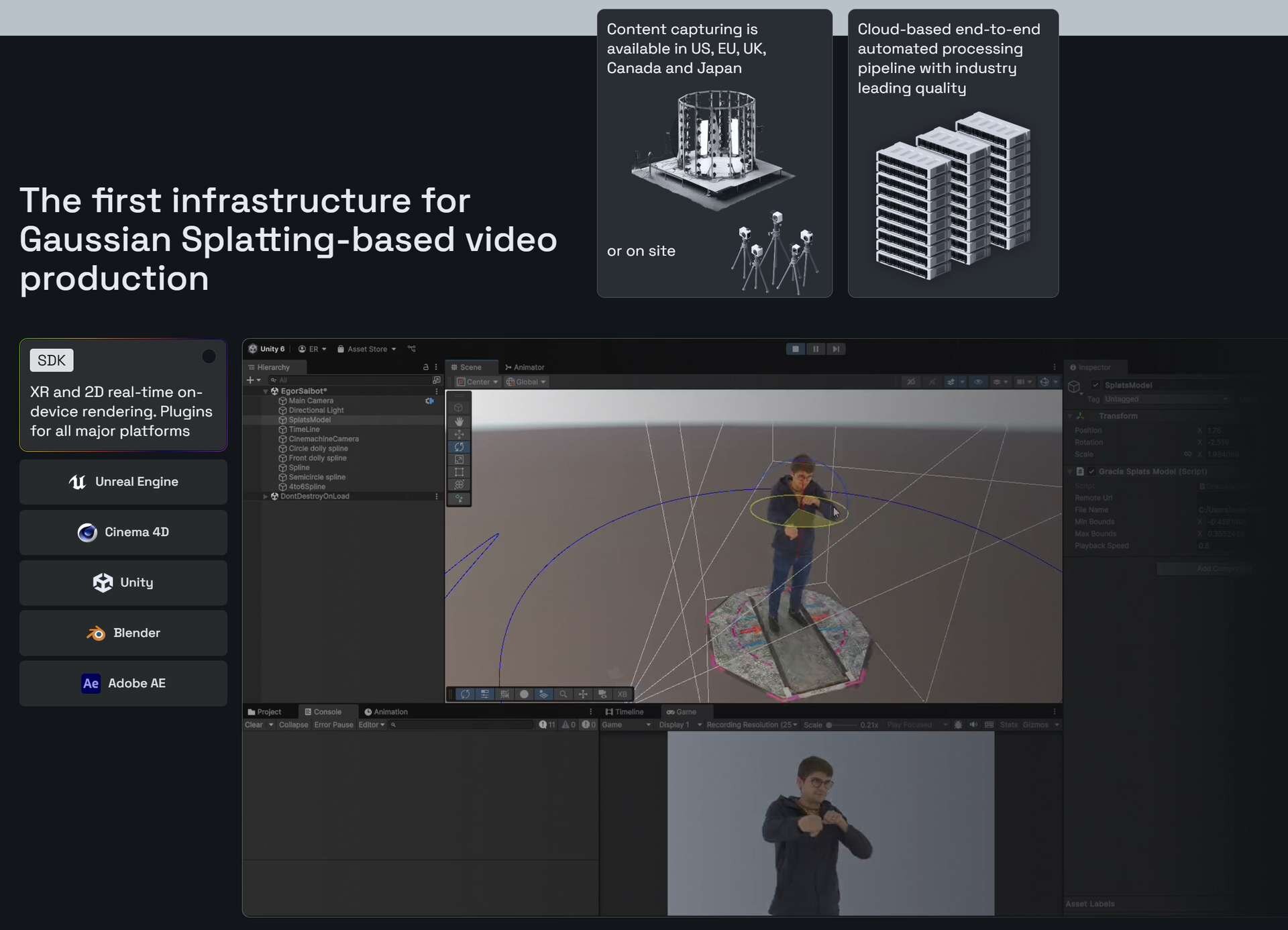 同社はクラウドベースの自動処理パイプラインを構築しており、日本を含む世界5地域で専用スタジオや出張でのボリュメトリックキャプチャ(現実の空間や人物を3Dデータとして丸ごと撮影する技術)に対応。さらに、Unreal EngineやCinema 4D、Unity、Blender、After Effects向けの専用プラグインも開発中だ。