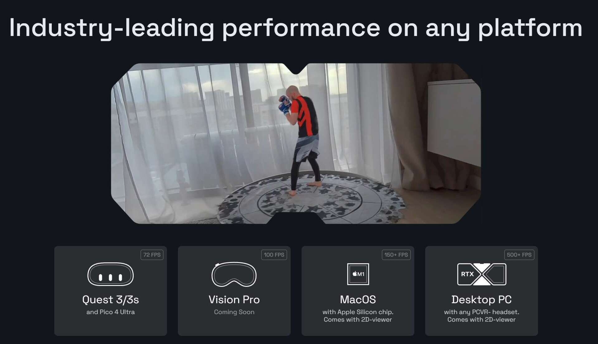 対応デバイスは幅広く、Meta Quest 3やPico 4 Ultraといったスタンドアロン型のVRヘッドセット(72 fps動作・要最新OS)をはじめ、Apple M1チップ搭載のMac(150 fps以上)、NVIDIA RTX GPUを搭載したデスクトップPC(500 fps以上)などで業界最高クラスのパフォーマンスを発揮し、将来的にはApple Vision Pro(100 fps動作)への対応も予定されている。