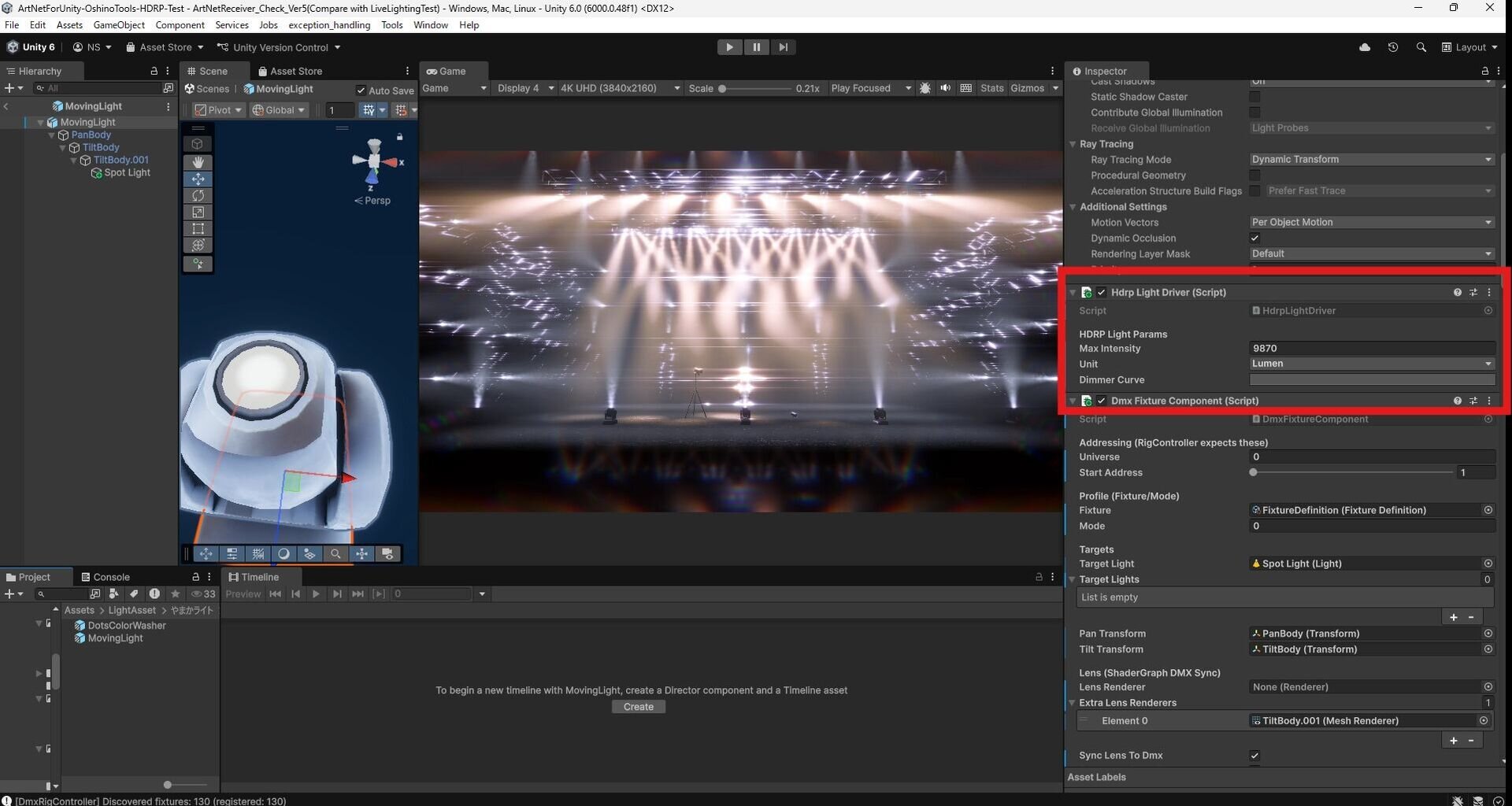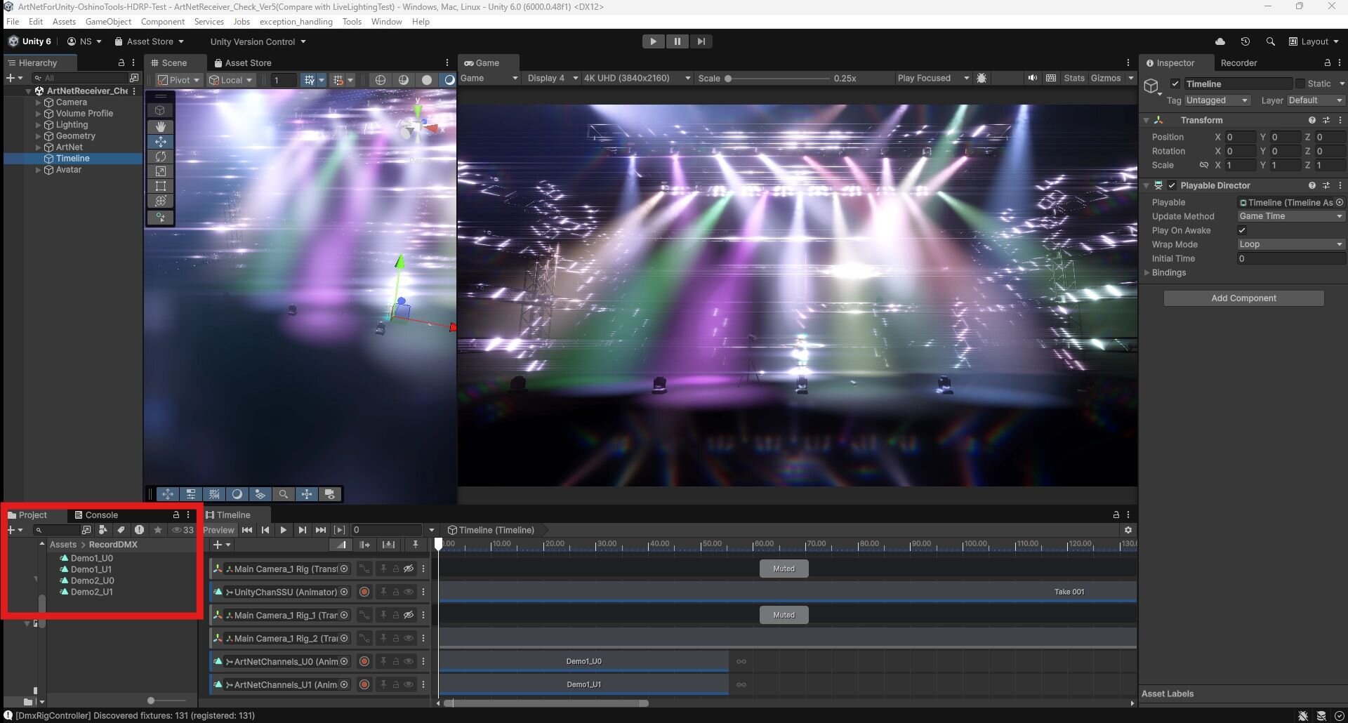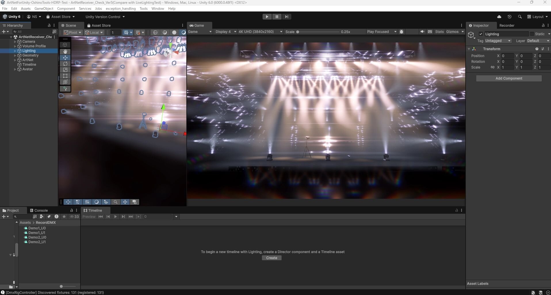 TimelinePlaybackモードでは、ライブモードで記録して書き出したDMXのアニメーションクリップを、Unityのタイムラインに配置して再生できる。これにより、リアルタイムでの即興的な操作だけでなく、事前に綿密に作り込んだ照明演出を映像作品や音楽の進行と正確に同期させる用途にも対応する。