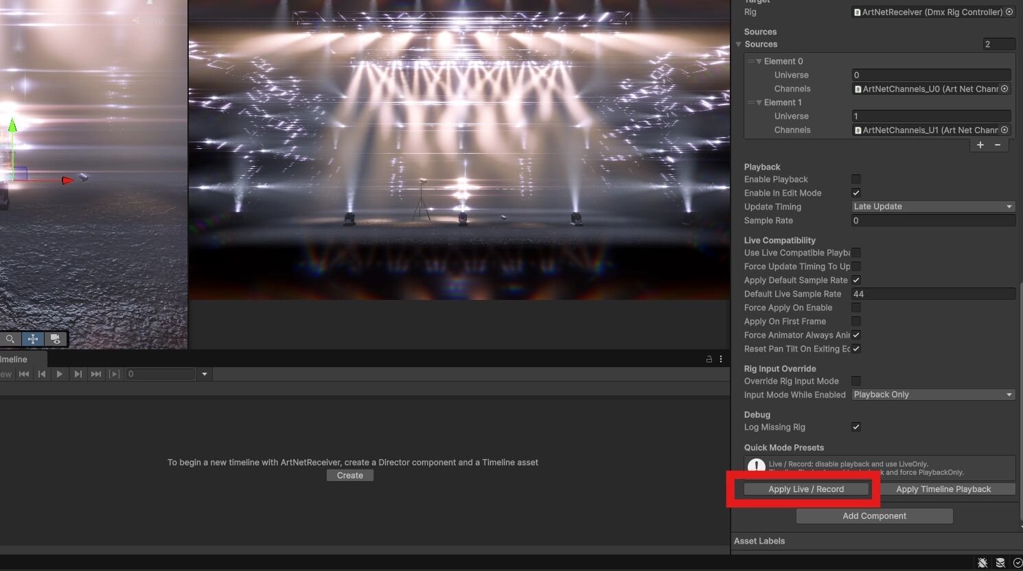 Art-Net DMX Lighting for UnityにはLiveモードとTimelinePlaybackモードという2種類の動作モードが用意されている。
