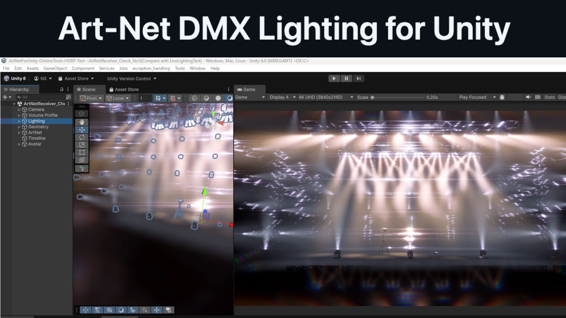 Oshino氏は3月7日(土)、Unity上で動作する照明制御システム「Art-Net DMX Lighting for Unity」をGitHubで公開した。本システムは、実際の舞台照明などで用いられる標準的な通信規格のDMX信号を、ネットワーク経由で送受信するプロトコルのArt-Netを介してUnityで受信し、バーチャル空間内の照明をリアルタイムに制御できるオープンソースのプロジェクト。ソースコードおよびUnityアセットは商用利用も含めて自由に使用・改変ができるMITライセンスで提供されている。