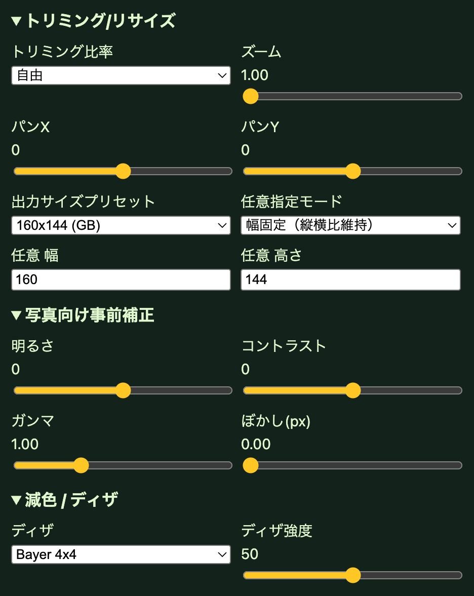 ディープブリザード氏は3月4日(水)、写真やイラストをゲームボーイ仕様のドット絵に変換できる無料のWebツール「GB Dot Converter」を公開した。作者自身が自作ゲームのグラフィック制作作業を効率化するために開発され、ゲーム開発ソフト「GB Studio」用のPNG保存やSNS用拡大PNG保存などの画像書き出し機能を備える。