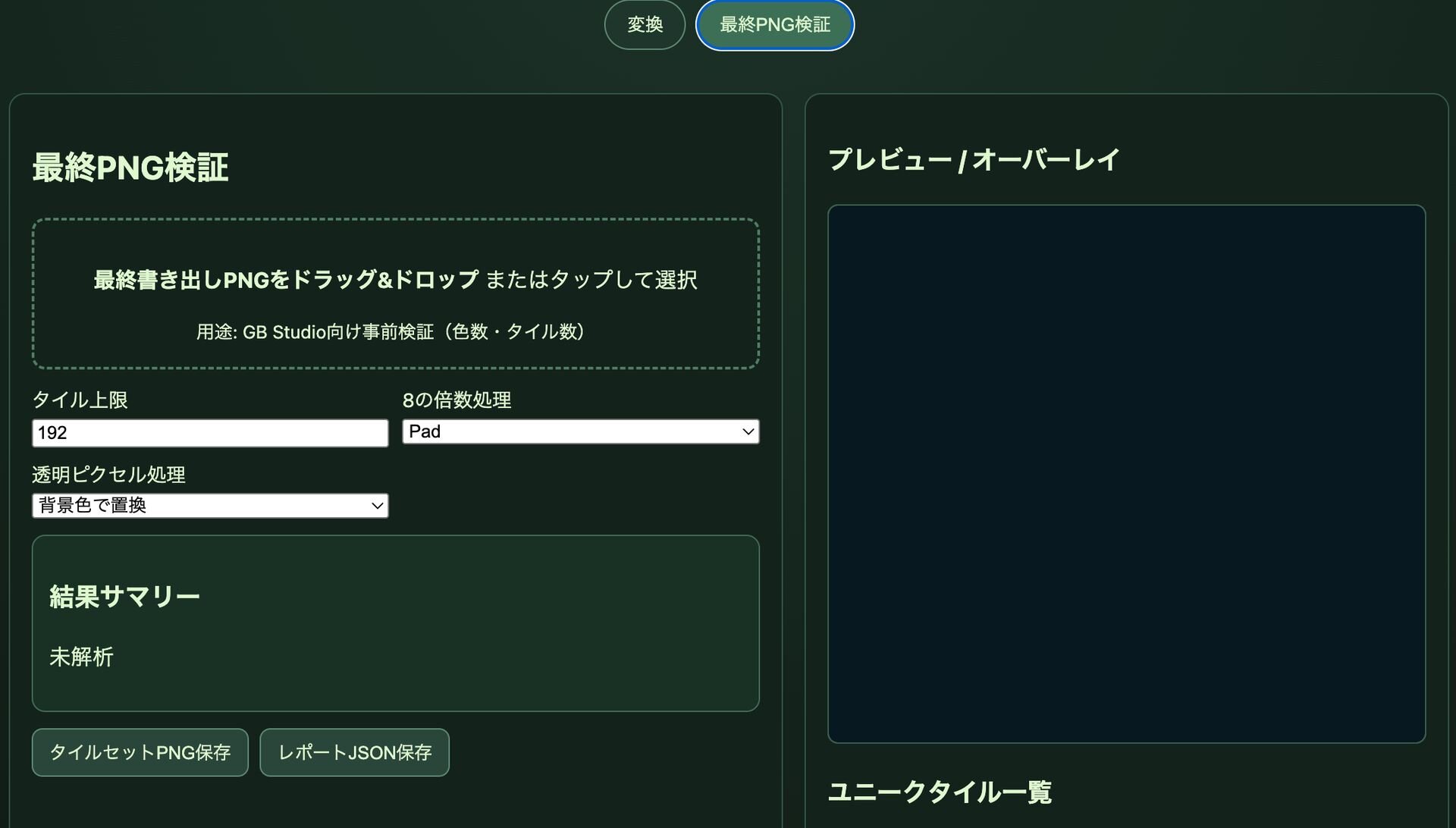 「GB Dot Converter」では、単にドット絵に変換するだけでなく、ゲームボーイ実機の画面解像度に合わせた切り抜き、ゲーム内で使用できる画像部品の上限を確認する「ユニークタイル数」のチェック機能など、実機で表示可能な仕様に合わせた画像調整機能を備える。
