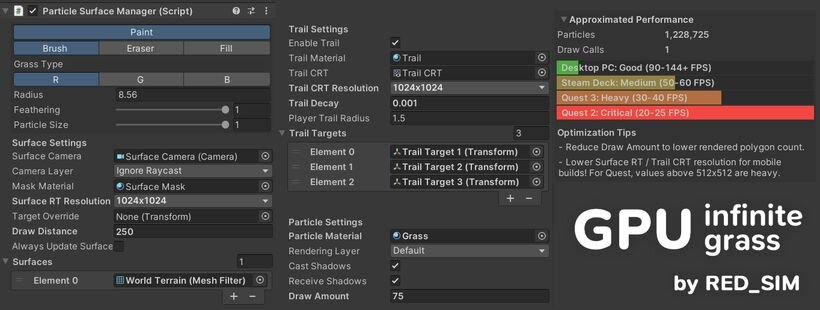 RED_SIM氏は2月17日(火)、VRChatワールドなど向けの軽量かつ高速な草描画システム「GPU Infinite Grass」(Unityエディタ拡張)をBOOTHとPatreonでリリースした。2月25日(水)に機能拡充となるバージョン1.1.0アップデートも配信している。GPU Infinite Grassは、モバイル環境やMeta Quest環境など、処理性能に制限のある端末にも対応しながら、地平線まで続く数百万本もの草をレンダリングできるシステム。プレイヤーや移動するオブジェクトとのインタラクション(自然な動き)を実現する。BOOTHでの価格はStandard Useが2,500円、Commercial Useが9,000円。