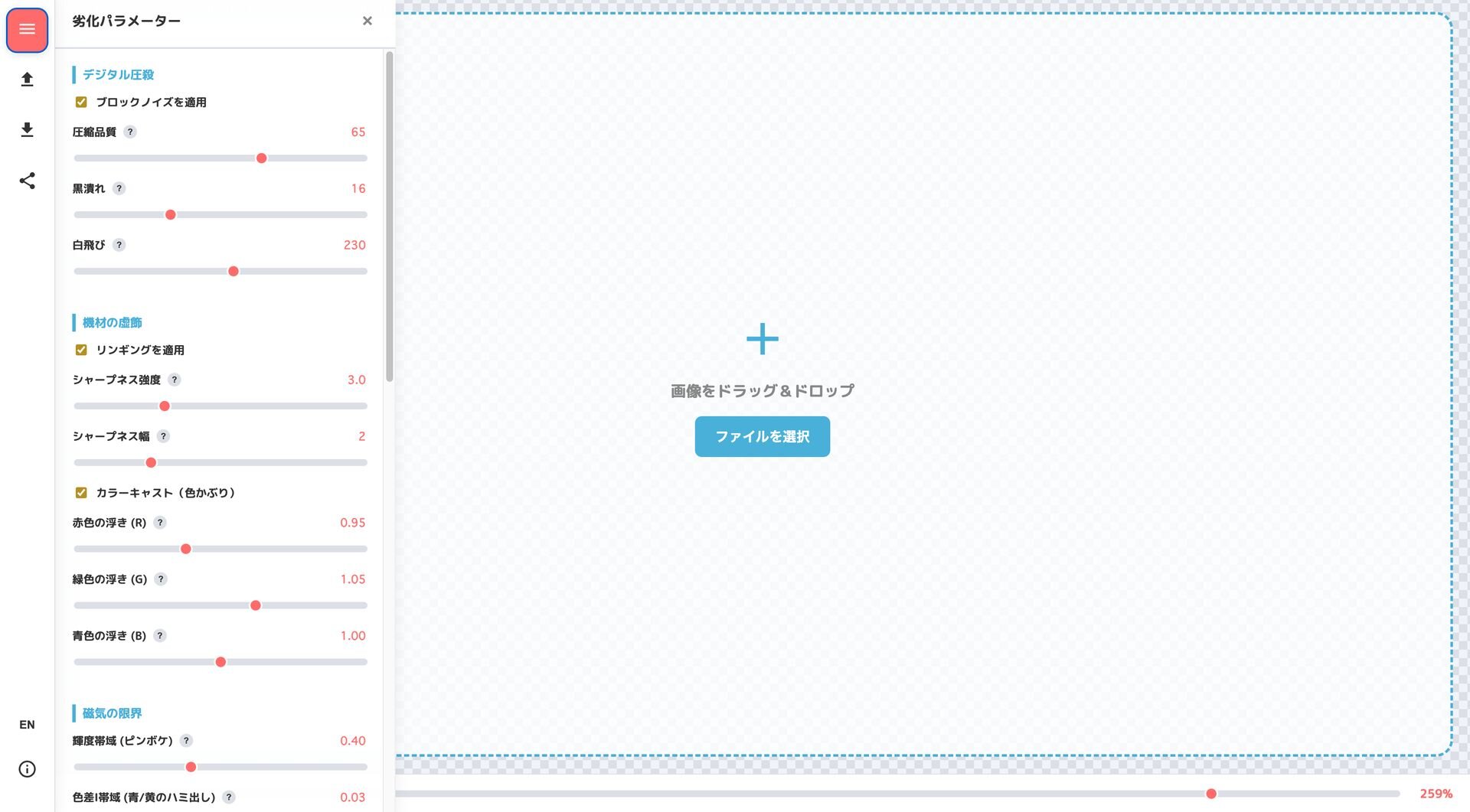 ひやめし氏は3月15日(日)、平成初期のビデオ映像を黎明期のインターネットにアップロードした際の劣化した画質を再現する無料のWebアプリ「HEISEI-VHS」をリリースした。「デジタル圧殺」「機材の虚飾」「磁気の限界」「メカニカルエラー」など画質劣化に関する多数のパラメータを備え、適用結果はPNG画像として保存できる。