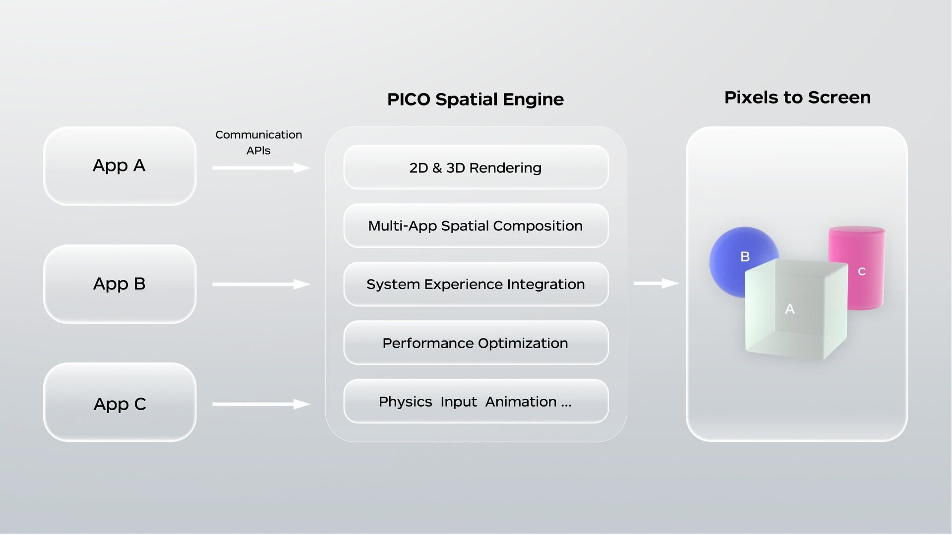 Introduce PICO Spatial Engine, a unified rendering architecture. It delivers spatial multitasking. Run multiple 3D apps, 2D apps, with your virtual and physical environments simultaneously. It's only possible with a unified rendering architecture.