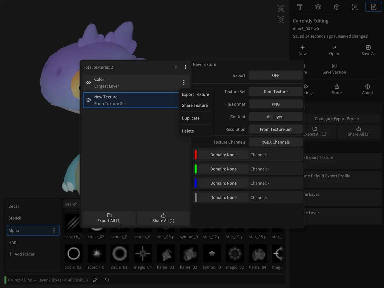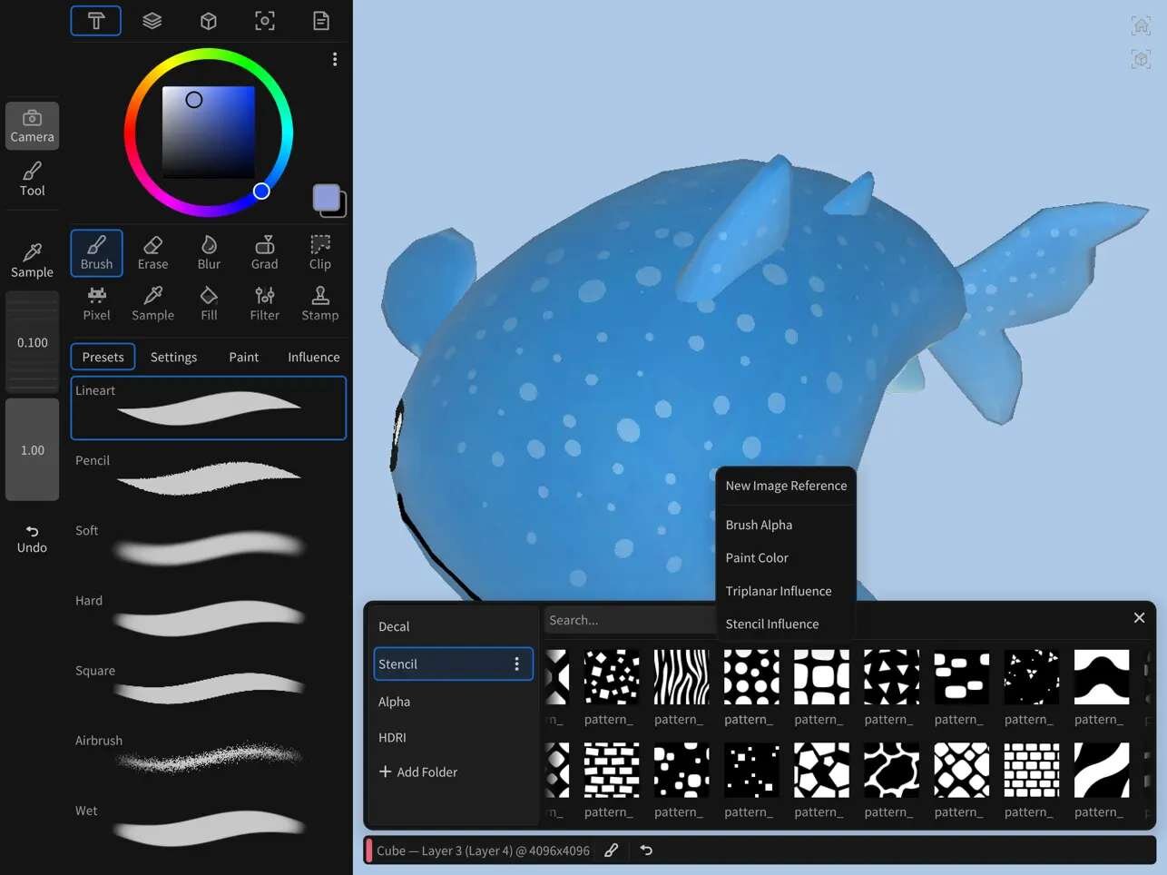 アプリには、3方向からテクスチャを投影して貼り付けるTriplanar Projectionsや、アルファブラシ、デカールなどを統合管理するアセットブラウザを備える。さらに、面の向きやUVアイランドによってツールの影響範囲を制御するインフルエンスシステムなども搭載する。