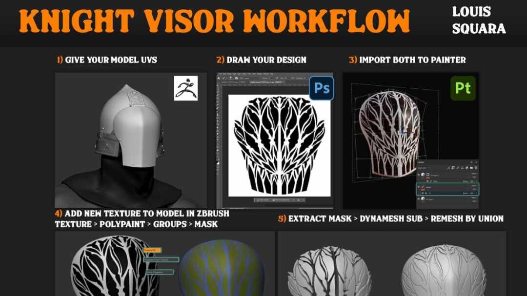 キャラクターアーティストのLouis Squara氏が、騎士のヘルメットのバイザーデザインと3D化までのワークフローを1枚の画像にまとめたチュートリアルをXに投稿。ZBrushとPhotoshop、Substance 3D Painterを組み合わせて木の枝のような複雑なデザインをバイザーに施す方法をステップバイステップで紹介している。