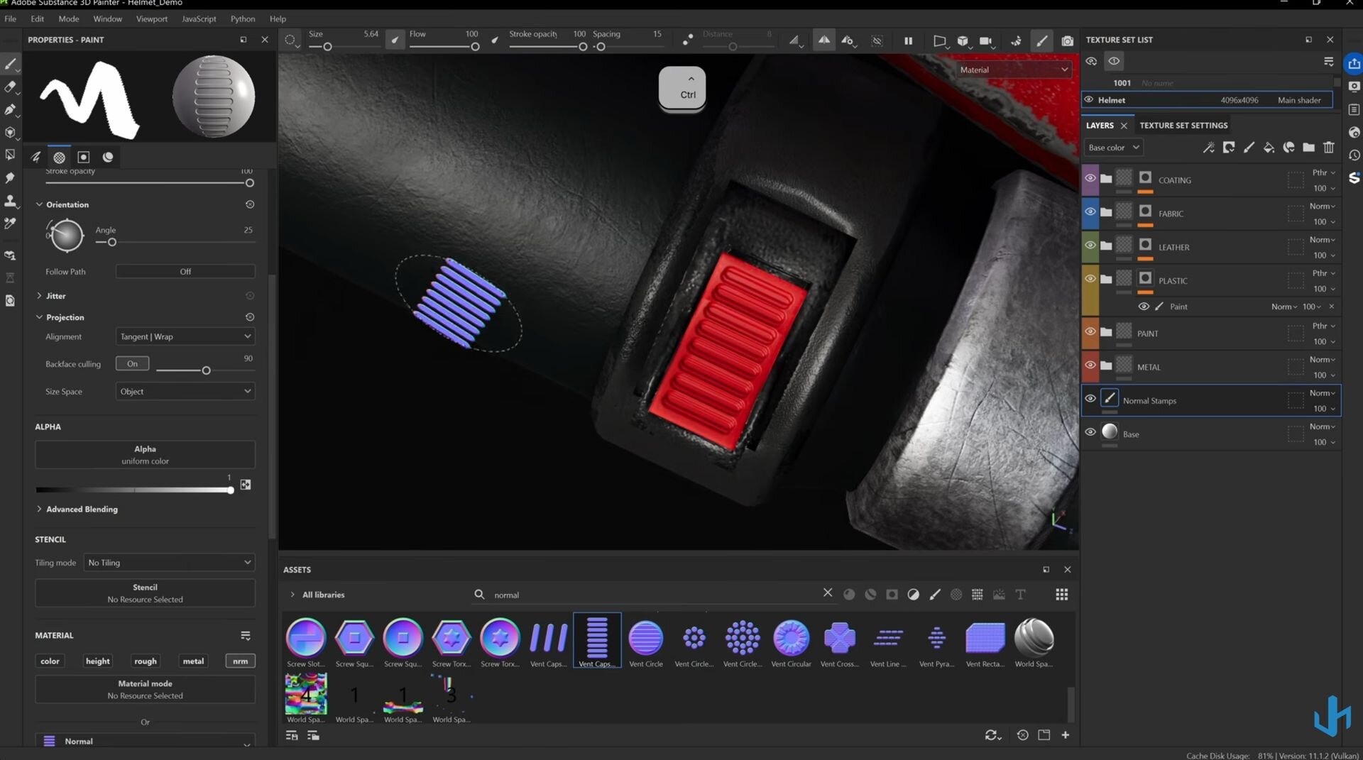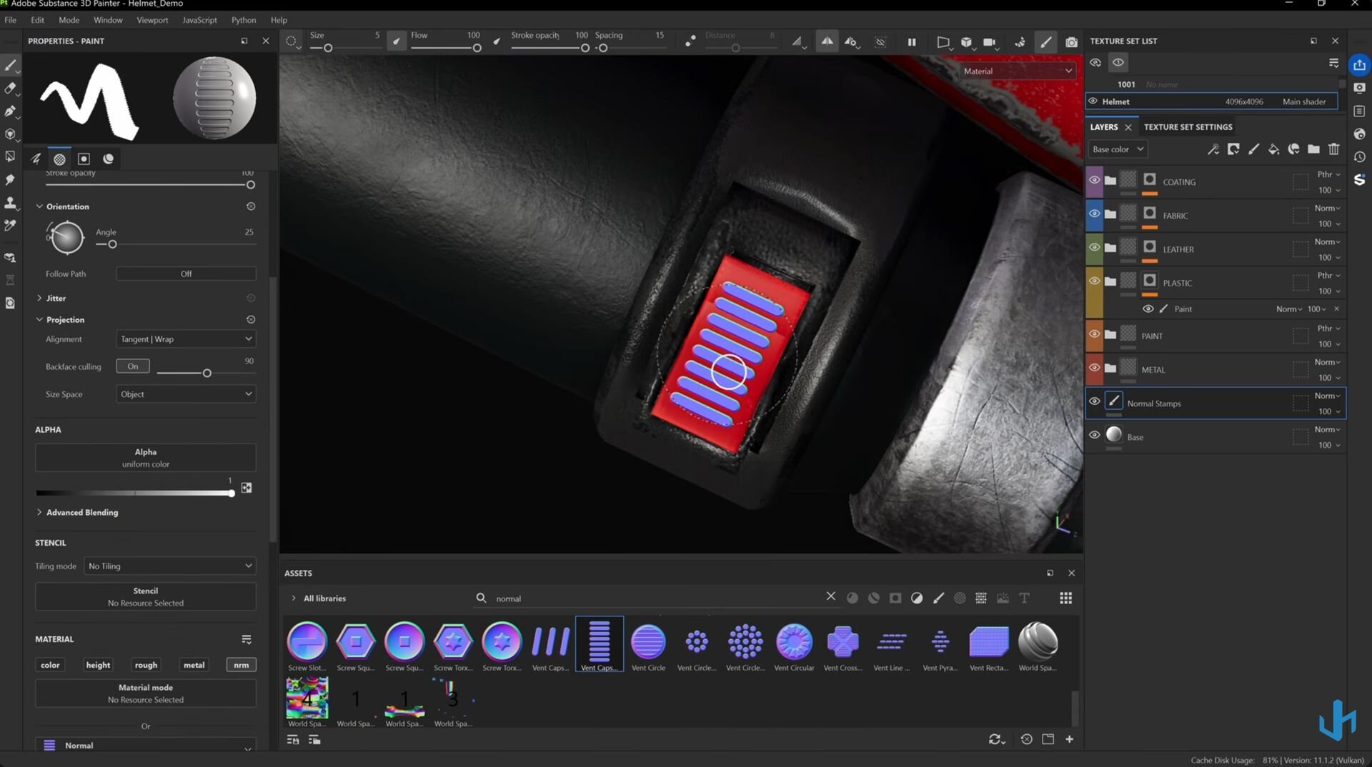 テクスチャリングの段階でモデル自体に手を加えることなく、ノーマルマップに直接形状をスタンプしてディテールを追加する手法も解説。ネジ穴やパネルラインのノーマルスタンプをレイヤーの最下層に配置し、それをAnchor Pointで取得させる。これにより、上位レイヤーに配置されたSmart Masksなどがスタンプされた凹凸を認識し、擬似的に追加されたディテールに対しても自然に汚れやエッジの摩耗が蓄積する。