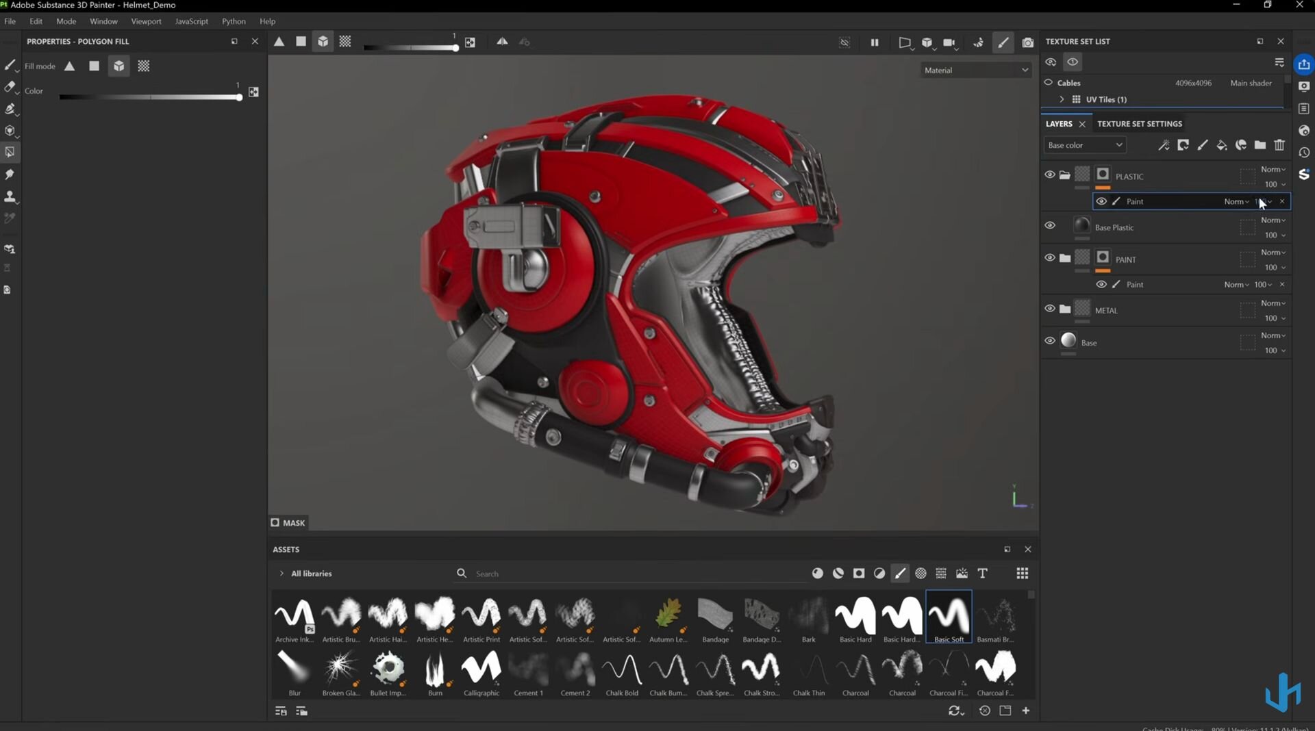 テクスチャリングの初期段階では、マテリアルごとにフォルダを作成し、ベースとなる塗りつぶしレイヤーを設定してシーン全体をブロックアウト(素材ごとに大まかに塗り分け)する手順を解説。J Hill氏は、各フォルダのブレンドモードを「Pass Through」に設定し、Base ColorやRoughnessなどのチャンネルごとに管理する基本ワークフローを強調している。これにより、のちの複雑なテクスチャリング工程においても柔軟な非破壊編集が可能となる。