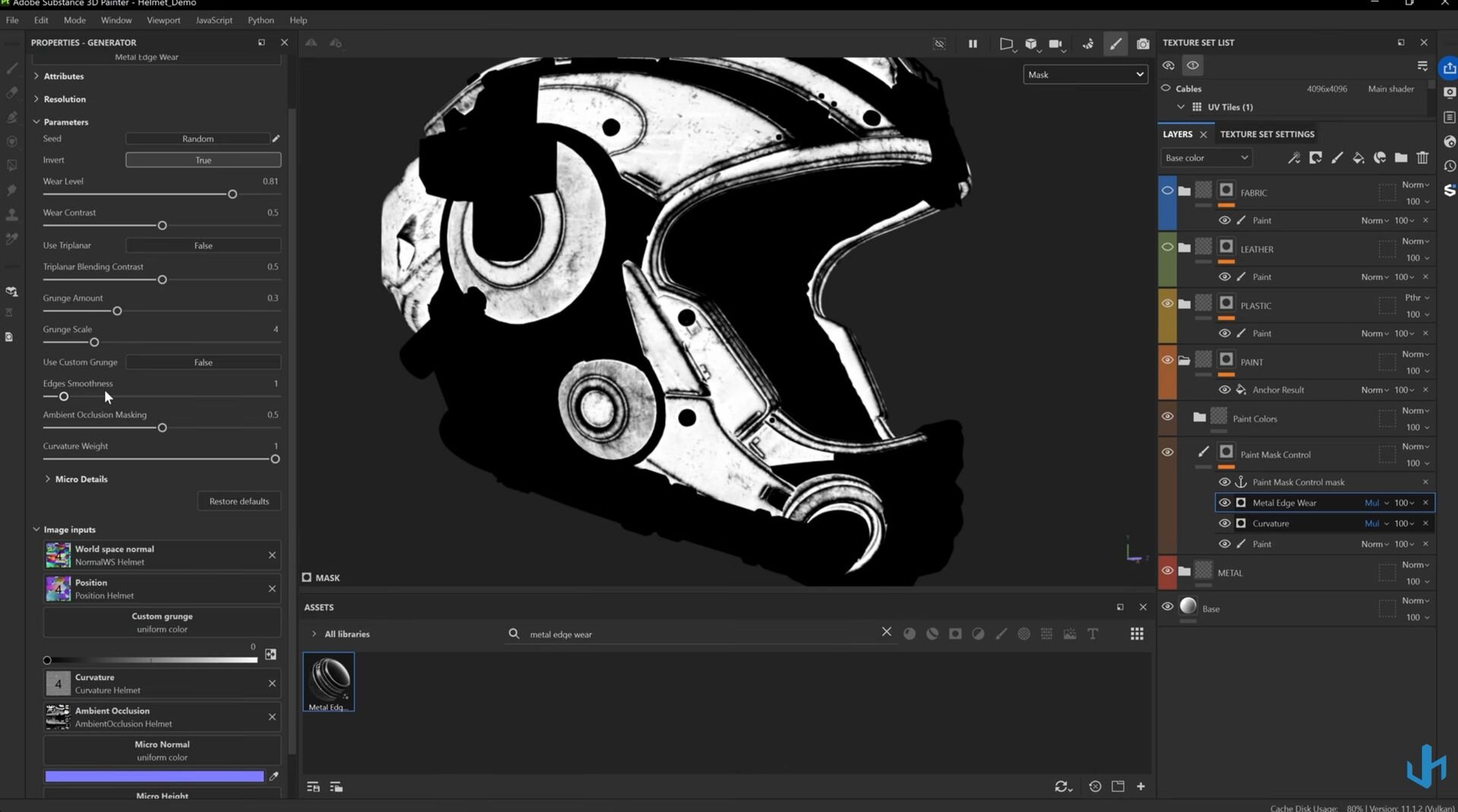 続いて、特に実践的なテクニックとして、Anchor Pointを活用した非破壊的なマスク制御方法が紹介されている。レイヤースタックの下層にペイントマスクを設定してアンカーポイントを作成し、それを上位レイヤーのマスクから参照することで、プライマー(下地)の露出やエッジの摩耗を連動させる手法である。さらにBevel Smoothなどのエフェクトと組み合わせることで、手描きのマスクから複雑で立体感のある塗装の剥がれを自動生成する高度なアプローチも紹介している。