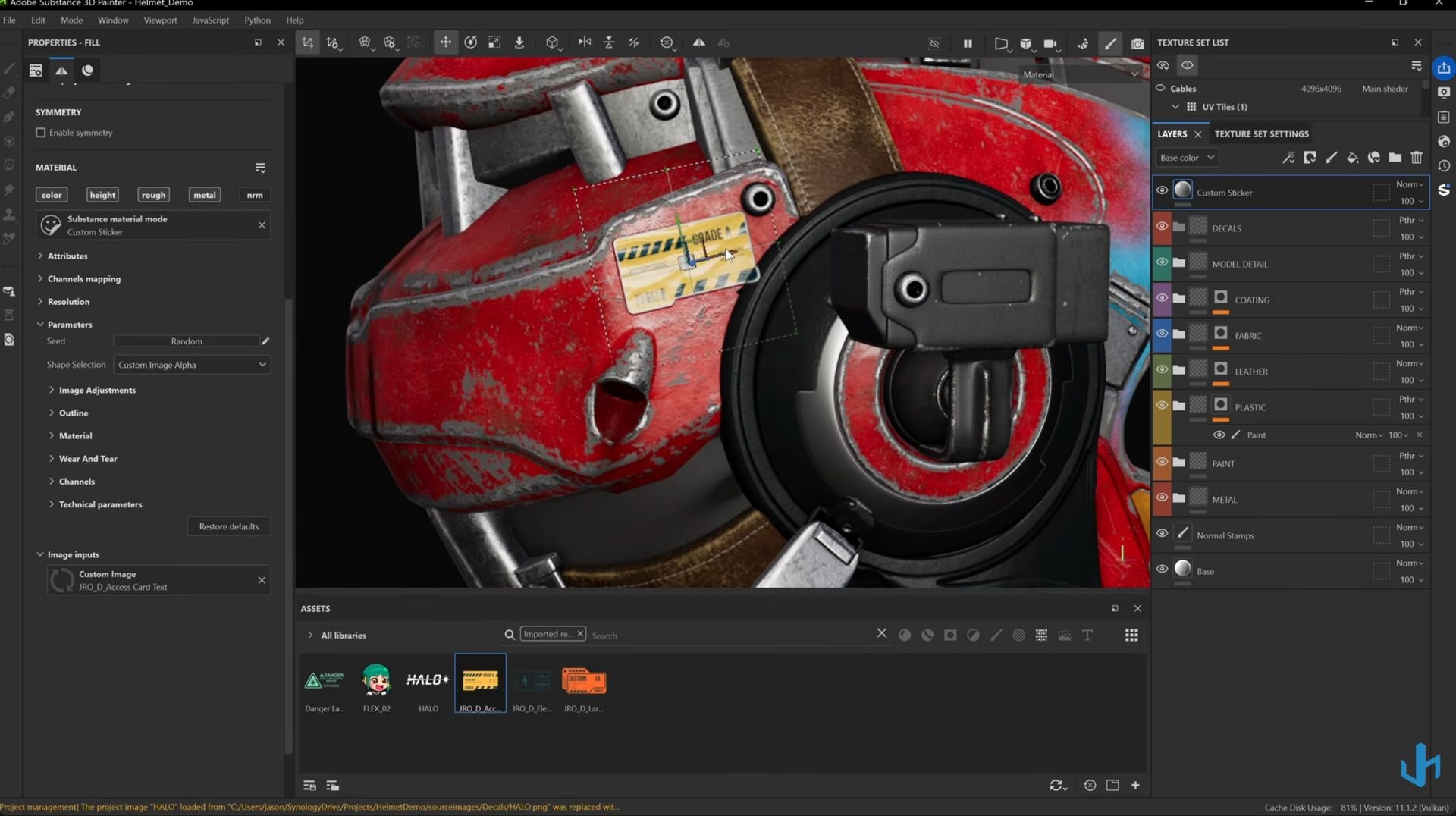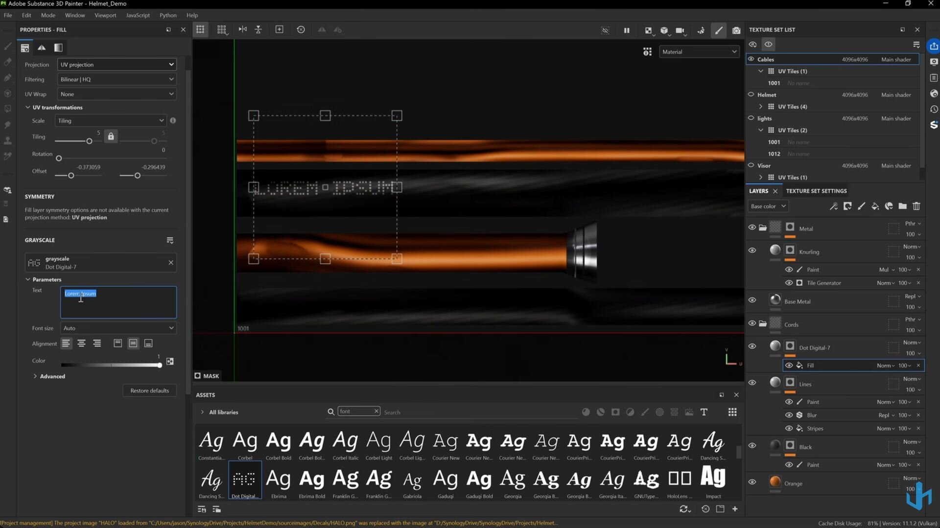 チュートリアルではさらに、モデルの情報量を高めるため、画像素材の直接投影によるデカール表現も解説している。貼ったステッカーの縁の厚みや、擦り切れダメージを細かく調整し、下地の質感を透過させている。また、テキストツールを用いて外部フォントをインポートし、ケーブルのカーブ面に沿って非破壊で印字テキストを配置・調整する手順も紹介。