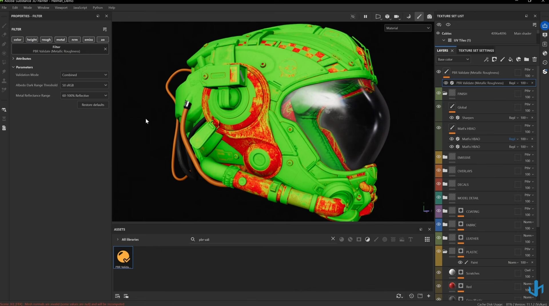 仕上げの工程では、Unreal Engine向けにPBR値を検証するフィルタの使用法を説明。特にUnreal Engineでの暗部の黒つぶれを防ぐため、Albedo Dark Range Threshold(暗部のしきい値)を50 sRGBに設定し、暗すぎるベースカラーを補正する実務的なチェックを行なっている。最後に、カスタムの出力テンプレートを用いて、オクルージョン、ラフネス、メタリックの各マップを単一のテクスチャのRGBチャンネルにパックして出力した。