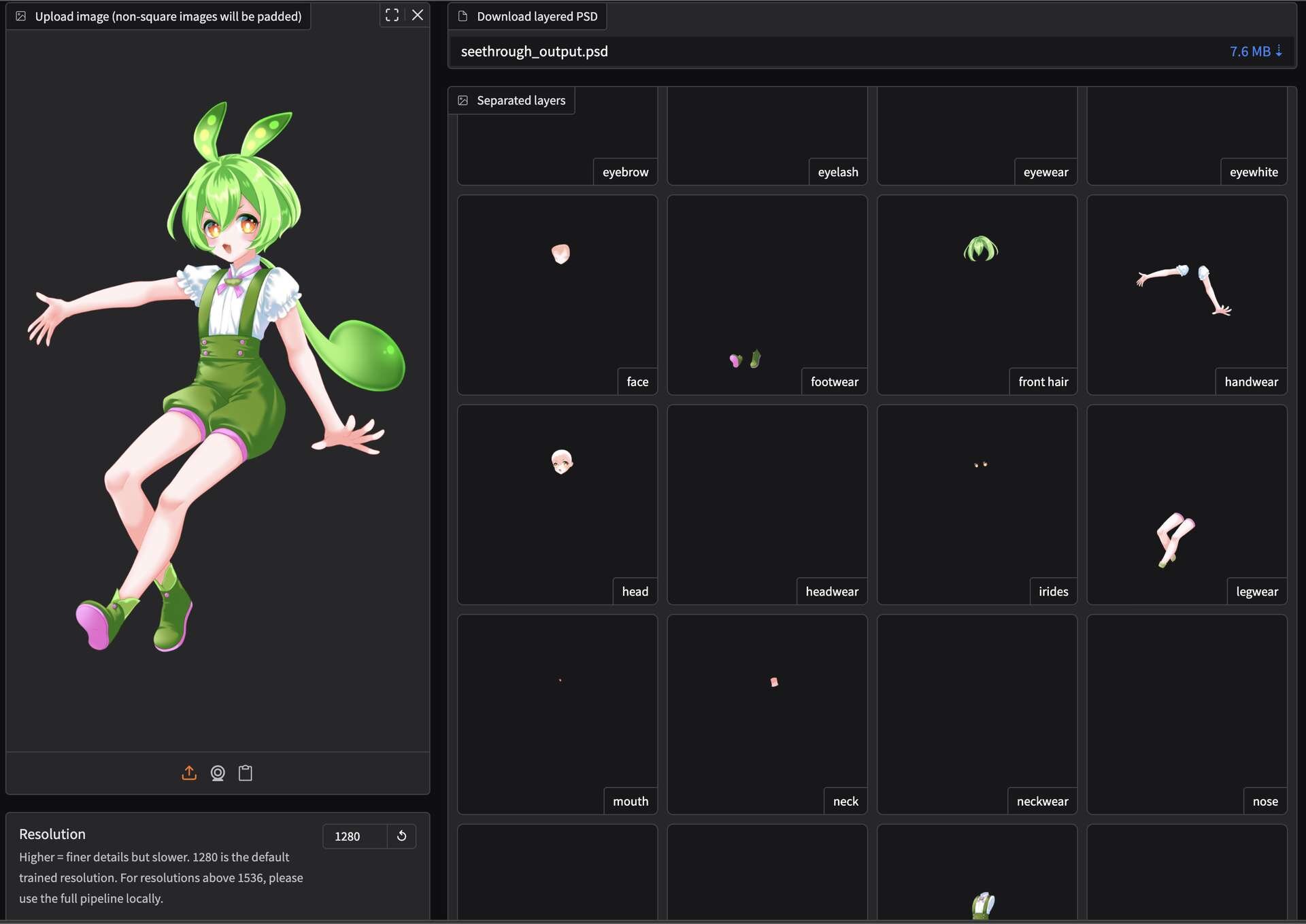今話題の、イラスト1枚を各パーツに分解してpsd出力してくれる「See-through」を比較的手軽に試せるWebUIを作りました。色々めんどくさそうな環境構築もたぶんきっと簡単…なハズ(動作はRTXの2060以上必須)https://t.co/INSr5SVT7i pic.twitter.com/TQMNTCFtLl