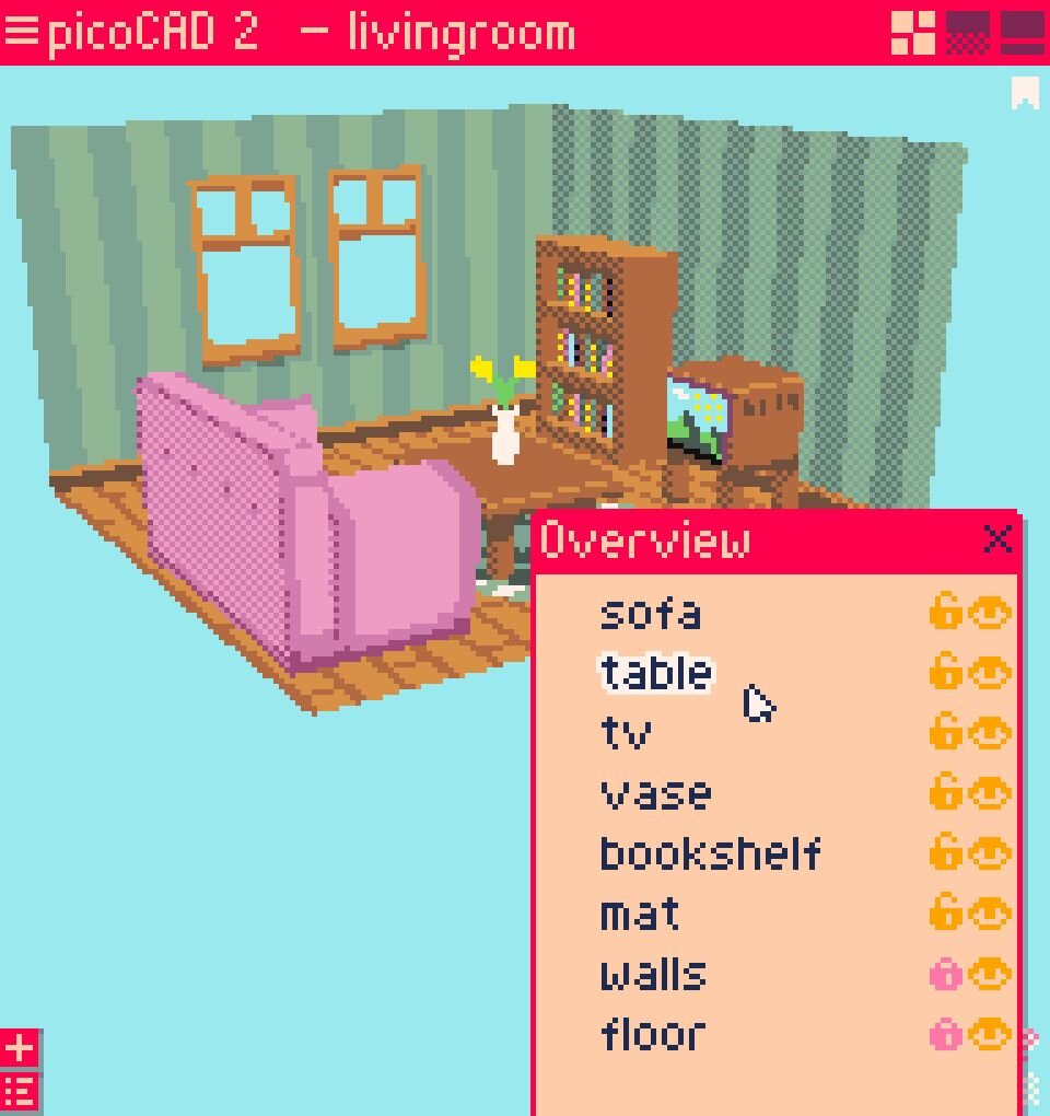 「picoCAD 2」は、3DCG制作未経験のユーザーでもレトロスタイルの3DCGを制作できるよう、機能を厳選したツール群を備える。あえてローポリとローレゾ(低解像度)で構成する独自のビジュアル表現を追求し、レトロなゲームグラフィックス特有の魅力を引き出すことを目的とする。