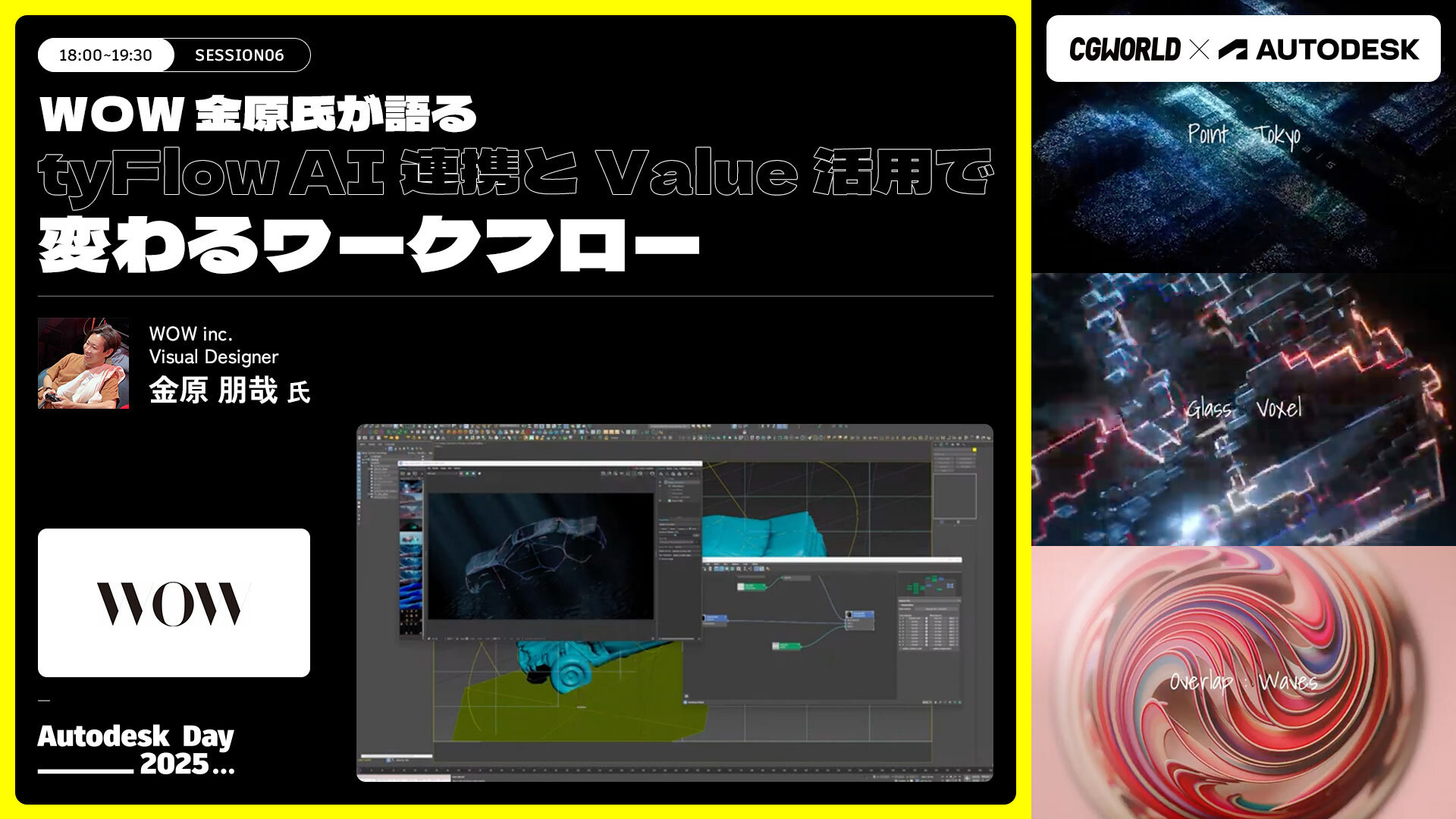 3ds MaxとtyFlowを自在に操るWOWの金原氏が、以下の3本立てで活用事例をお届けします。