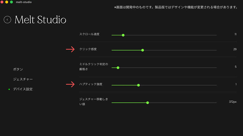 専用アプリ 「Melt Studio」 では、クリックの重さ、スクロールのノッチ感、モード切り替えの操作方法、ジェスチャーへのショートカット設定などを自由にカスタマイズ可能。