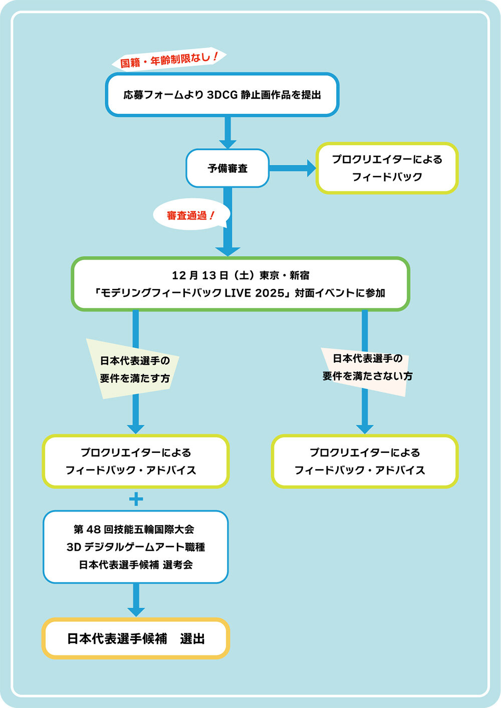 「モデリングフィードバックLIVE 2025」対面イベントは、来年9月に中国・上海で開催される「第48回技能五輪国際大会」の3Dデジタルゲームアート職種日本代表選手候補選考会を兼ねている。「モデリングフィードバックLIVE 2025」対面イベントで制作した作品を国際大会基準で審査、成績上位者のうち以下の要件を満たす方から1名を「日本代表選手候補」として選抜し、技能五輪国際大会に挑戦できる。