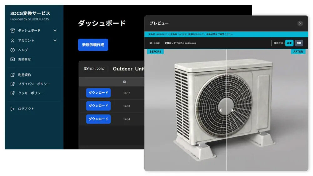 このたび、スタジオブロスはオンライン上でアセット変換の依頼、見積り、変換結果のプレビュー、変換後のデータ取得までを一貫して行うことができる法人向けサービスとして、正式提供を開始する。