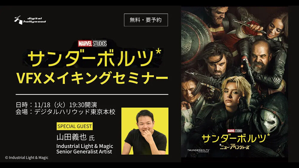 IT・デジタルコンテンツ分野の人材育成スクールのデジタルハリウッドは、ハリウッドの第一線で活躍するアーティスト・山田義也氏(Industrial Light & Magic)を講師に迎え、マーベル最新作『サンダーボルツ*』の制作舞台裏に迫るVFXメイキングセミナーをデジタルハリウッド東京本校にて11月18日(火)に開催する。