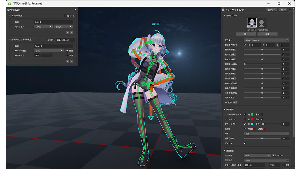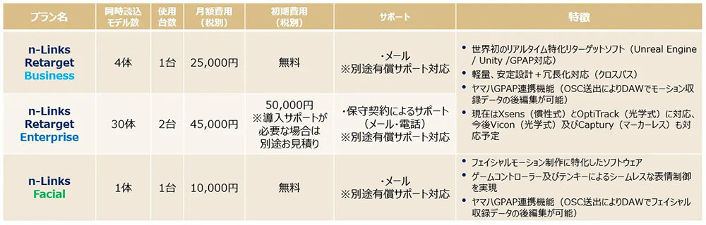 アイ・ペアーズが開発した「n-Links Retarget」は、ライブやTV番組・映画の制作現場で長年数多くのモーションキャプチャ収録を行う当社のノウハウを活かした自然なリターゲット処理を組み込み、運用するオペレーターの利便性、マルチプラットフォーム対応でタブレットでも動作する軽量さ、長時間収録に耐えうる安定性・冗長性を備えた新世代のリターゲットソフトウェアとなる。「n-Links Facial」は音声入力によるリップシンクに対応し、キーボード操作以外にゲームコントローラーのアナログ操作による柔軟な表情コントロールが特長だ。