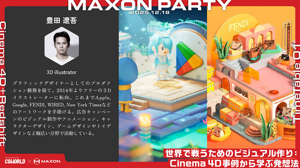 国内外で活動する3Dアーティストの豊田遼吾氏が、どうすれば世界中の大手クライアントから依頼が来るのか?どうすればワンランク上の3D作品が作れるようになるのかを、Cinema4Dを用いた実際の制作事例を元にお話しします。イラストレーションの基礎からアニメーションの制作過程、ゲームデザインの制作過程までをどのような思考プロセスでデザインをしているか掘り下げます。本セッションは仕事の幅をもっと広げたい3Dアーティスト、最近伸び悩んでいる中堅3Dアーティスト必見の内容です。