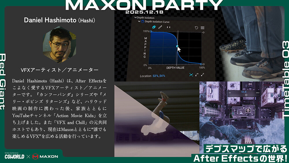 Hashi氏が映像制作におけるデプスマップの多彩で楽しい活用法を紹介します。Maxonの新しいAfter Effectsプラグイン「Depth Generator」を使ってデプスマップを作成し、ボリューメトリック合成、クリエイティブなトランジション、ステレオ変換、3D押し出し表現など、さまざまな用途への応用方法を共有します。
