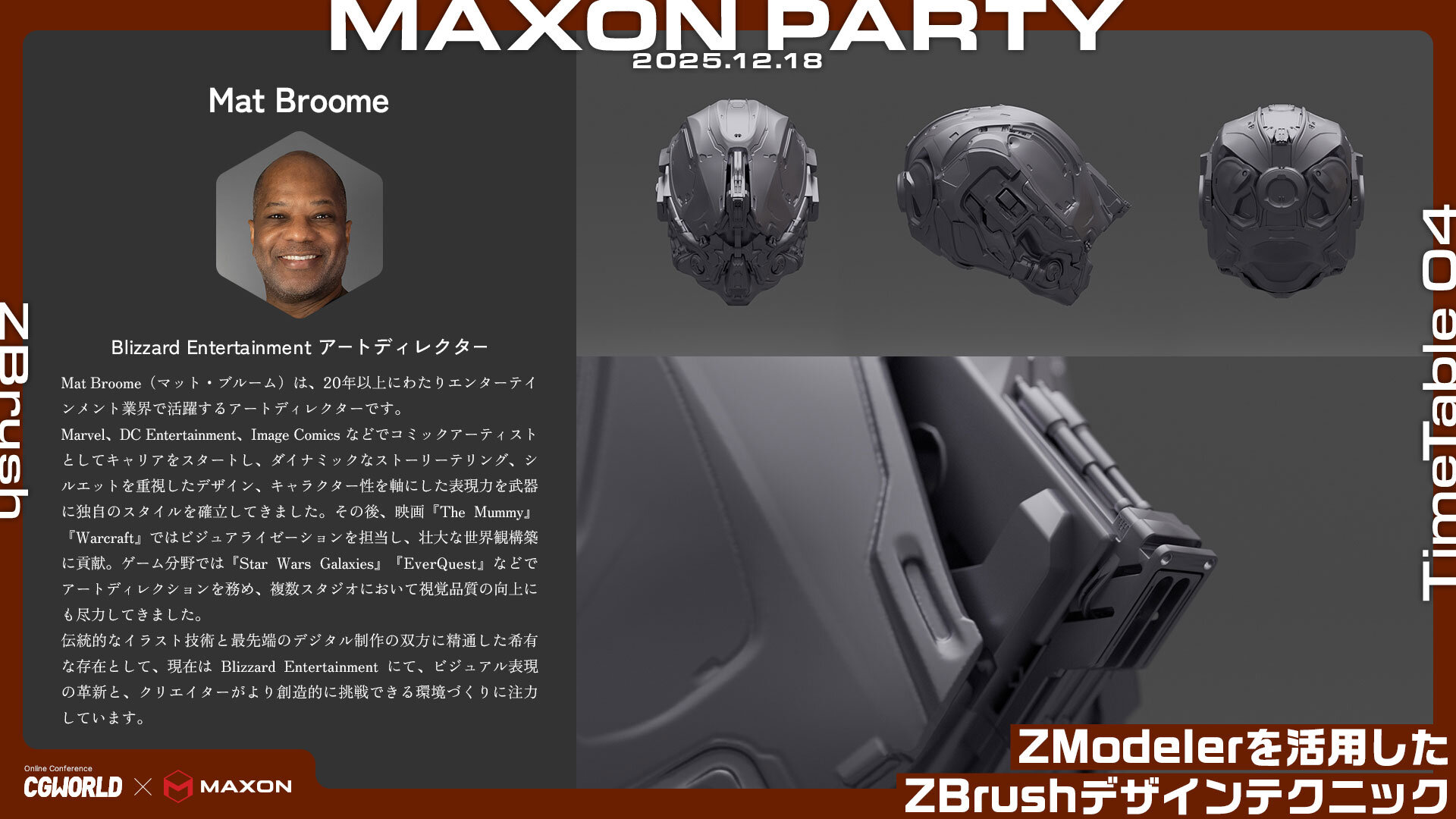 Mat Broomeは、AAAゲーム、映画、コミック、デジタルエンターテインメントの分野で20年以上にわたり活躍してきた、経験豊富なアートディレクター/ビジュアルディレクターです。本セッションではZModelerを活用した