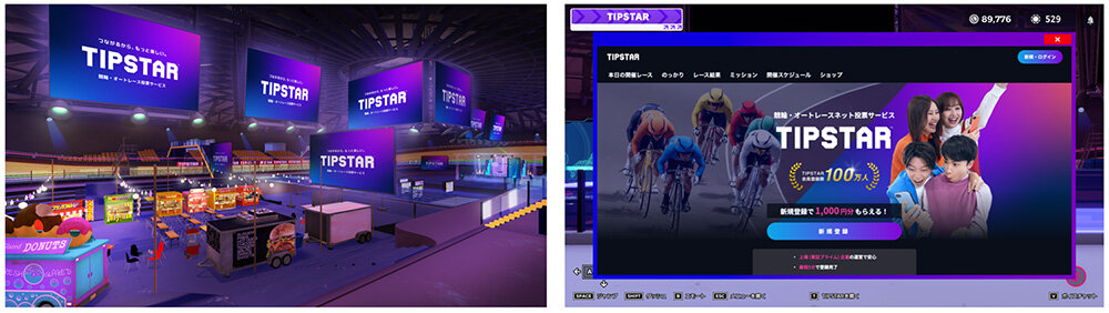 バーチャルの仮想競輪場内でパブリックビュー観戦や、「TIPSTAR」とのWebView連携による投票体験が可能。