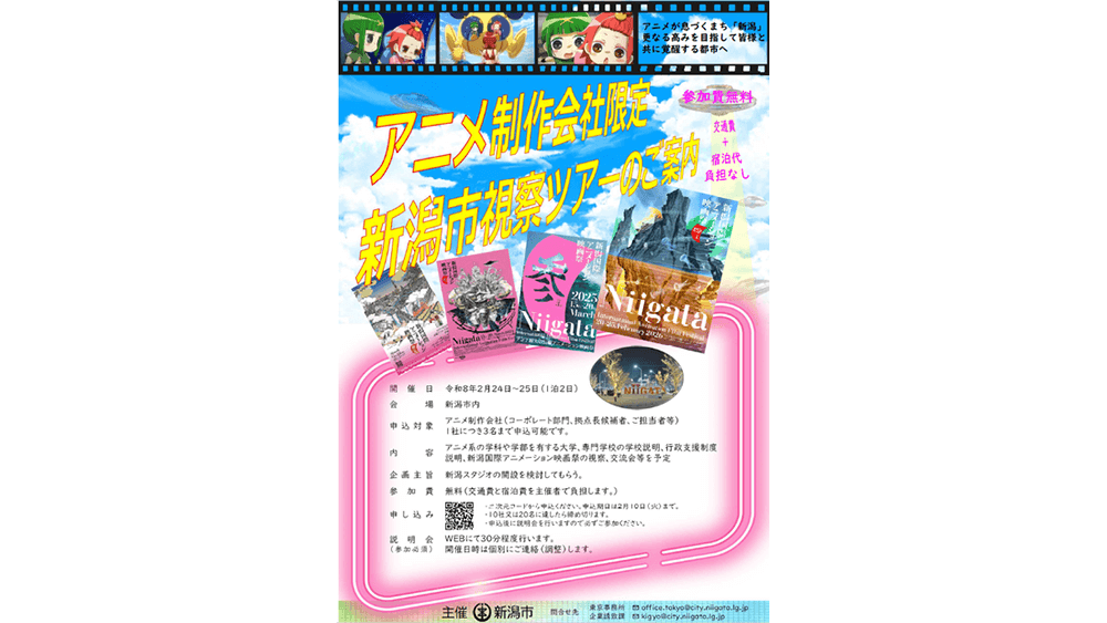 本ツアーは、新潟国際アニメーション映画祭の開催期間中に実施され、映画祭の視察も予定されている。産業としての可能性と文化的な魅力の両面から新潟を体感できる貴重な機会となっており、アニメ系企業の進出先として新潟に関心を持つ企業にとって、有意義な場となりそうだ。