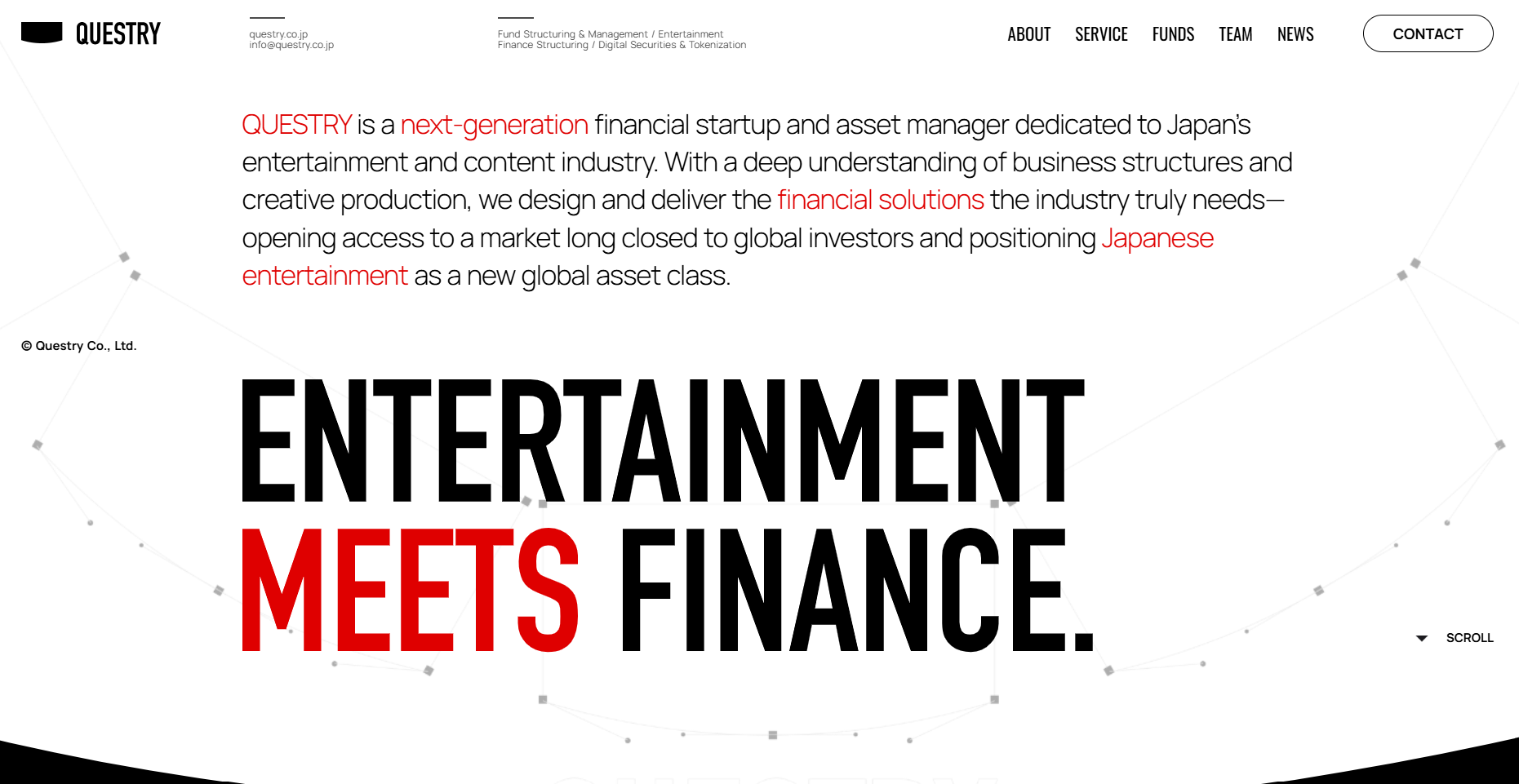 Questryは、みずほ証券と運営するアニメファンドなどの伝統的金融スキームから、セキュリティトークンを含む先進的手法までを活用し、日本のエンタメに新たな資金を呼び込む金融事業を推進している。日本のエンタメを世界的なアセットクラスへと高め、機関投資家から個人ファンまでが参加できる仕組みの構築を目指している。