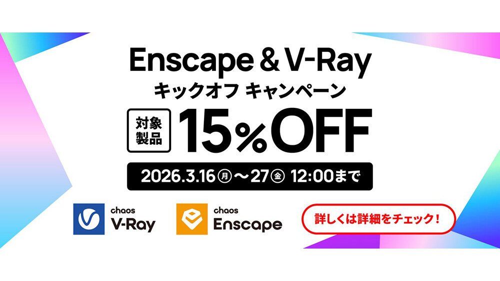3月16日(月)から3月27日(金)12:00まで、人気製品 Enscape & V-Ray を 通常価格より15%OFFでご購入いただけるキャンペーンを実施しています! この機会にぜひご検討ください。