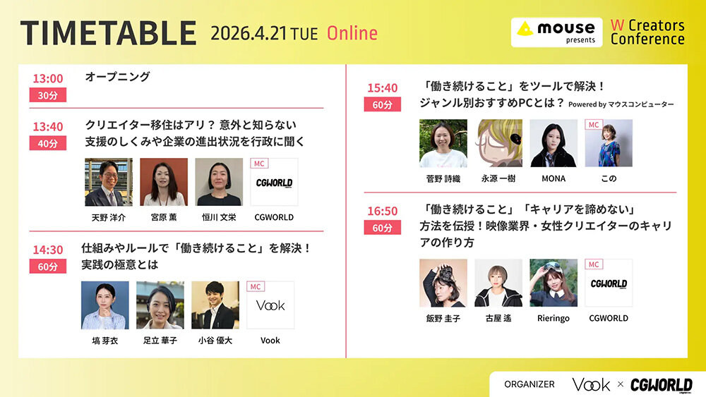 映像制作者向け情報プラットフォーム「Vook」と、ボーンデジタルが運営するCG・映像クリエイター向けメディア「CGWORLD」との共催により、無料オンラインカンファレンス「W Creators Conference」を4月21日(火)に開催いたします。