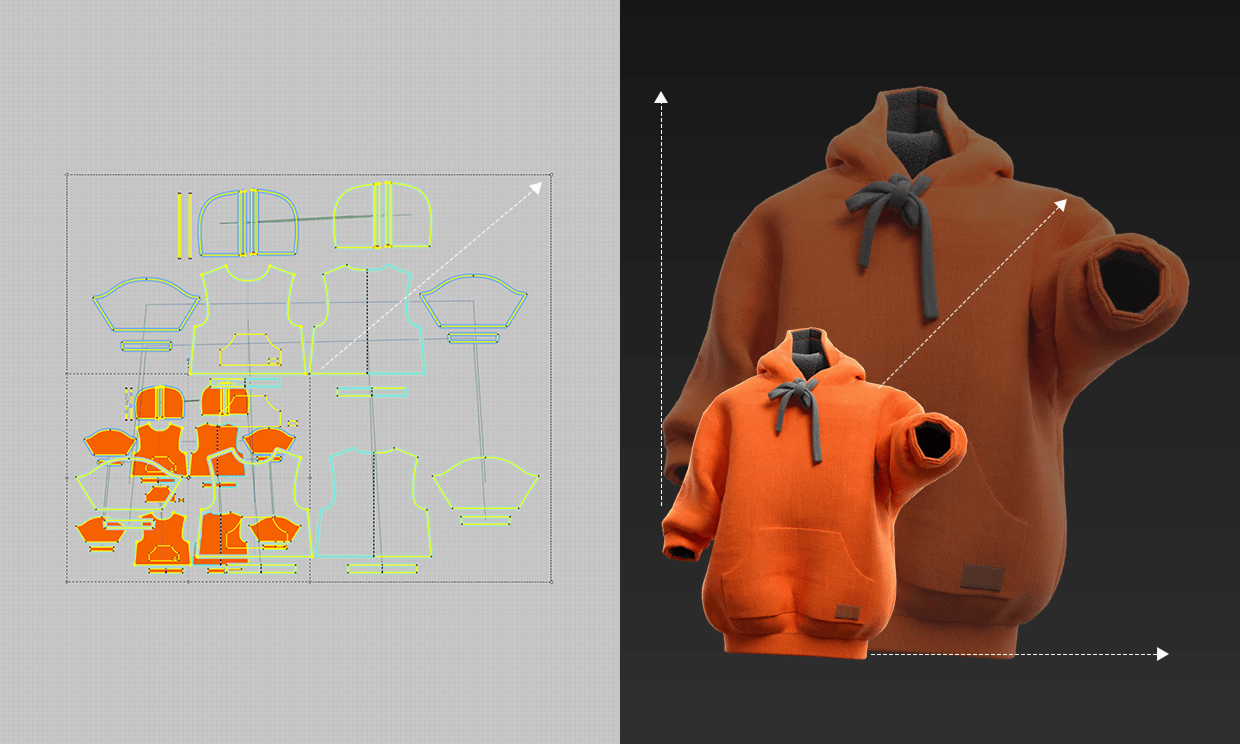 3D衣装の形状を維持したまま、2Dパターンのサイズや形状を変更できる機能が追加された。従来はパターン変更に伴いシルエットが変化するケースもあったが、本機能により見た目のバランスを保ちながら調整を行うことが可能となる。微調整時の再シミュレーションや修正作業の削減につながる。